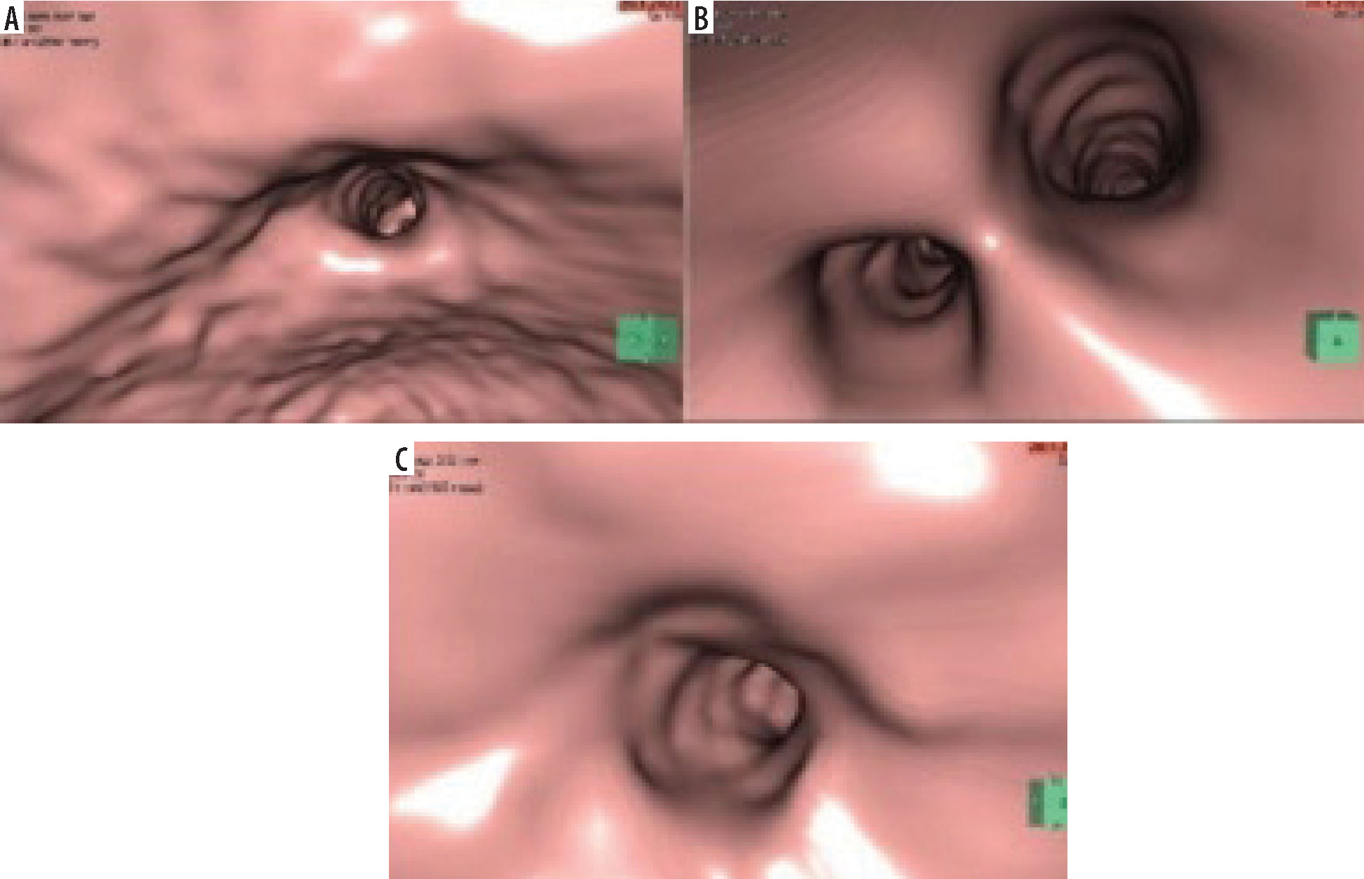 Post-processing was performed on a uWS-CT Workstation (Shanghai United Imaging Healthcare Co. Ltd.). The software allows a semiautomatic small vessel fly-through, which provides inside front and rear views, together with a view of the path and location on the surface of the heart (Figure 2). Besides this, 3 multiplanar reformation planes (sagittal, coronal, and axial) are shown for the location of the camera. The length tra-velled per major branch was recorded in millimetres, together with the time required in minutes to perform the evaluation per major branch. Ostia of side branches were visualized, but no fly-through of those side branches was performed.