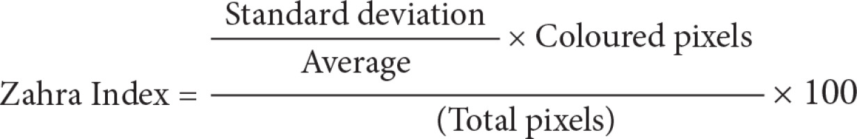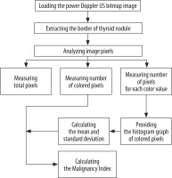 Step one: Loading the power Doppler US bitmap image and extracting the border of thyroid nodule by manually drawing a region of interest; Step two: measuring total pixels, number of coloured pixels, and number of pixels for each colour in the thyroid nodule; Step three: providing the histogram graph of the coloured pixels (Figure 3) and calculating the mean and standard deviation; Step four: calculating the Malignancy Index to identify the probability of malignancy for each thyroid nodule as defined below: