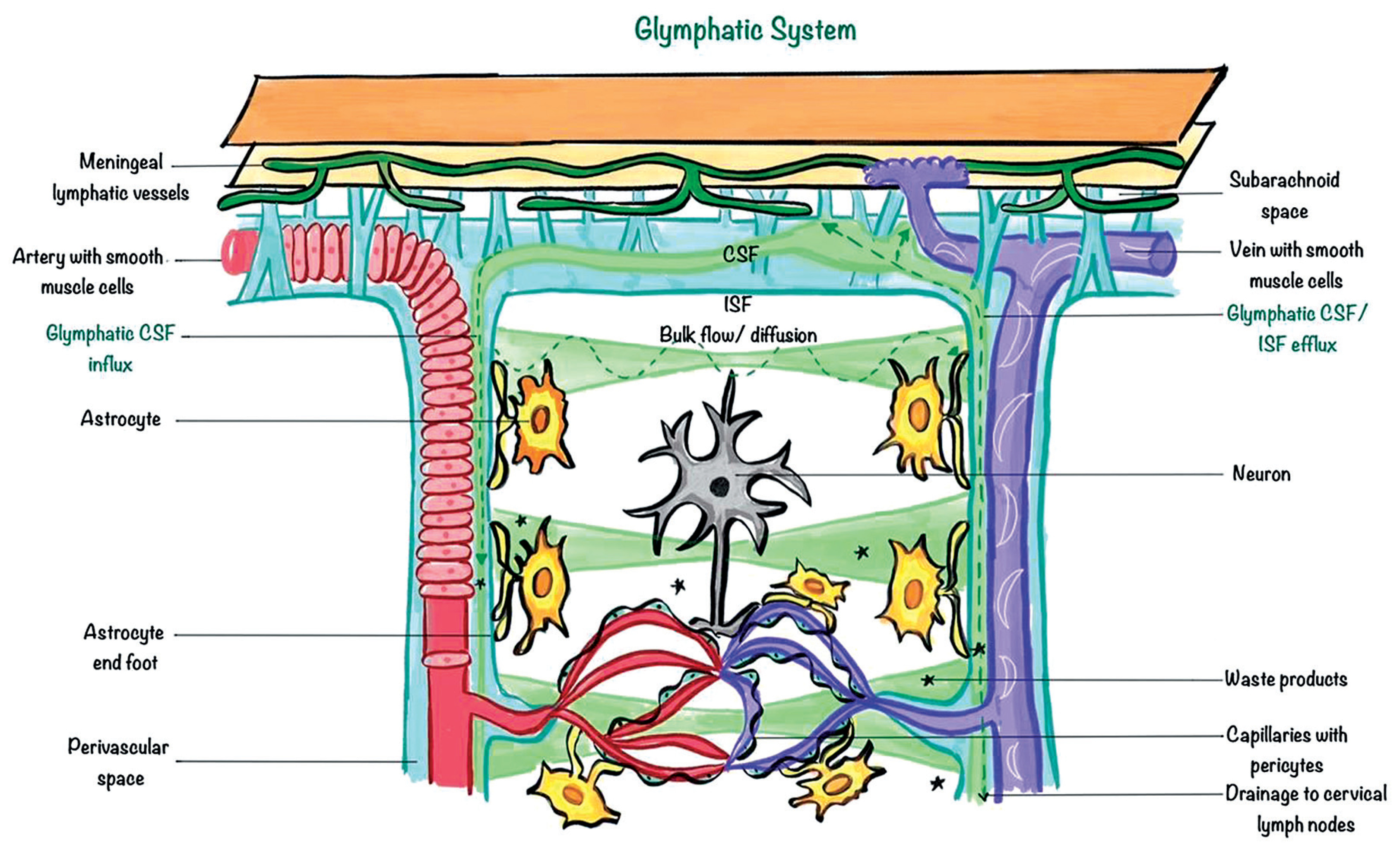 Illustration of the glymphatic system’s role in clearing waste from the central nervous system, highlighting the flow of cerebrospinal fluid (CSF) and interstitial fluid (ISF) through perivascular spaces and astrocytic end-feet