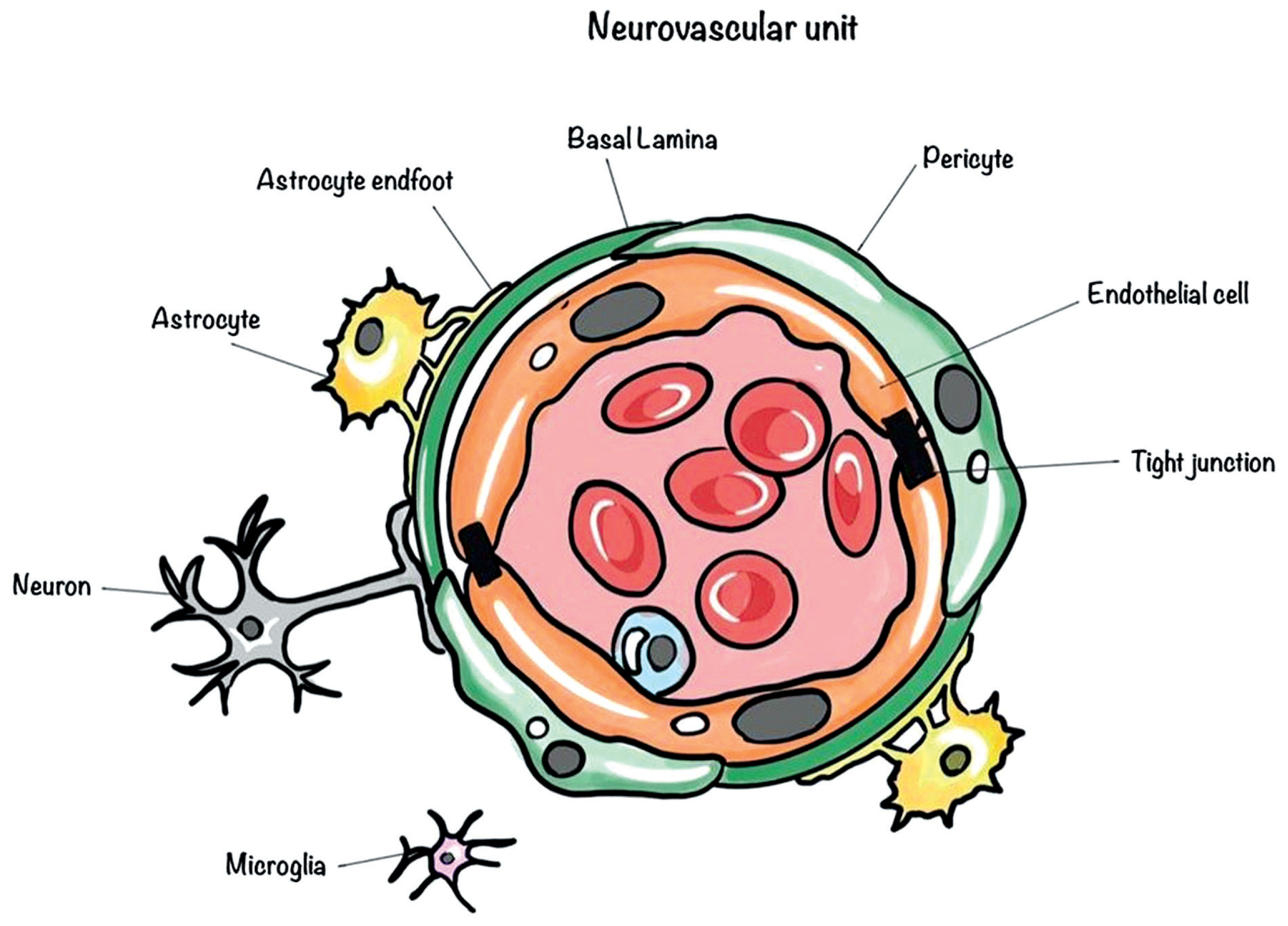 Illustration of the neurovascular unit, highlighting its components, including neurons, astrocytes, astrocytic end-feet, microglia, pericytes, endothelial cells, tight junctions, and the basal lamina, which together maintain the blood-brain barrier and regulate brain homeostasis