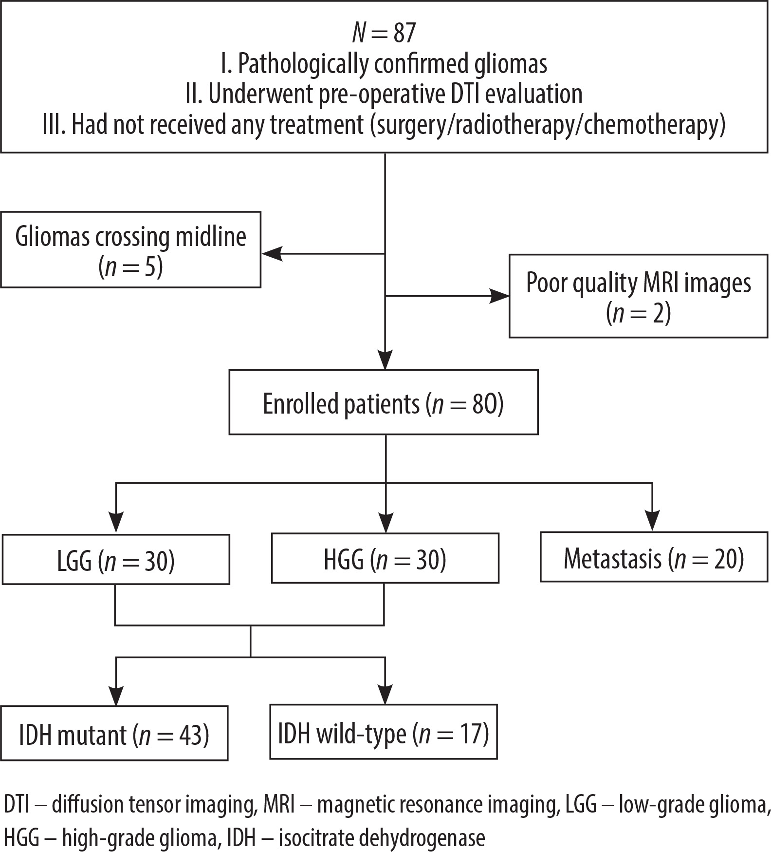 At our institution, a cohort of 87 patients diagnosed with a supratentorial tumour underwent preoperative DTI. Seven individuals were excluded due to poor-quality MRI images (n = 2) or gliomas crossing the midline (n = 5). The final study population consisted of 80 histopathologically verified intracranial tumours: 30 LGGs (World Health Organization grades I-II), 30 HGGs (grades III-IV), and 20 brain metastases. Among the 60 glioma cases, 43 exhibited IDH mutations, while the remaining 17 were IDH wild-type. The screening process is shown below (Figure 3).