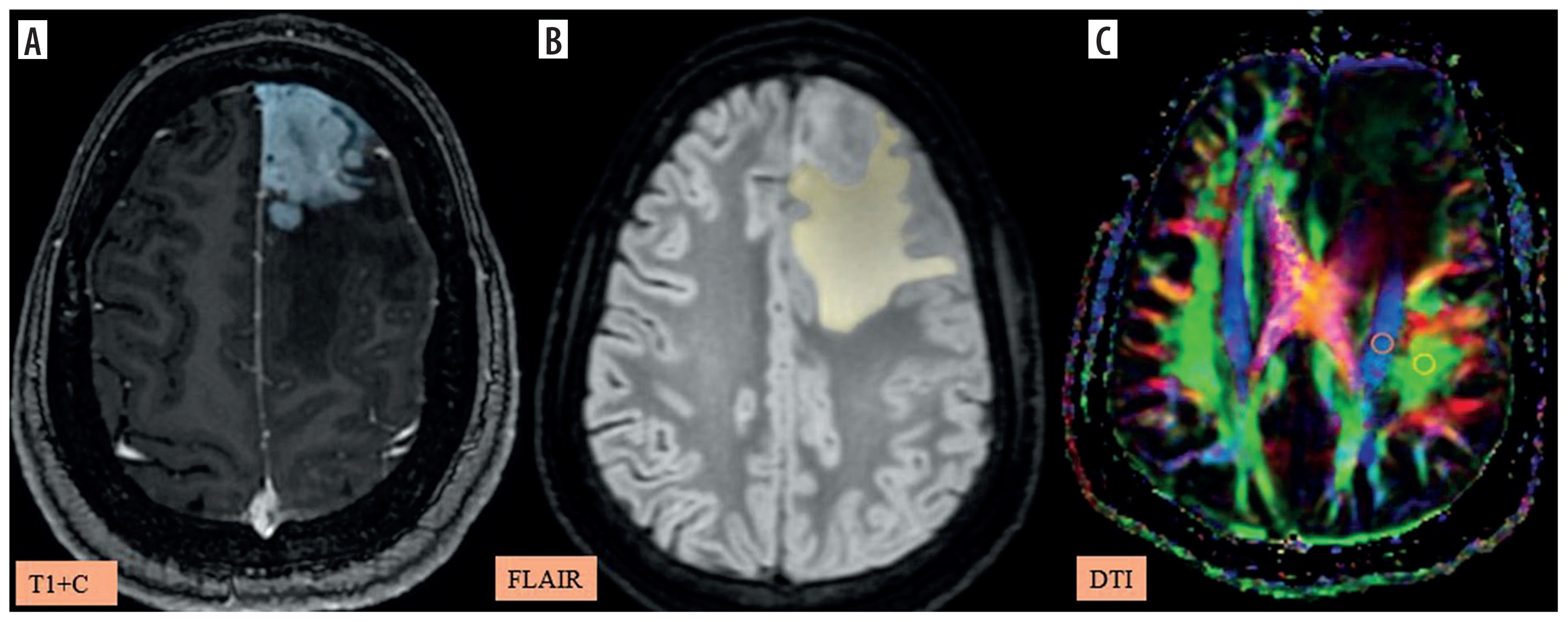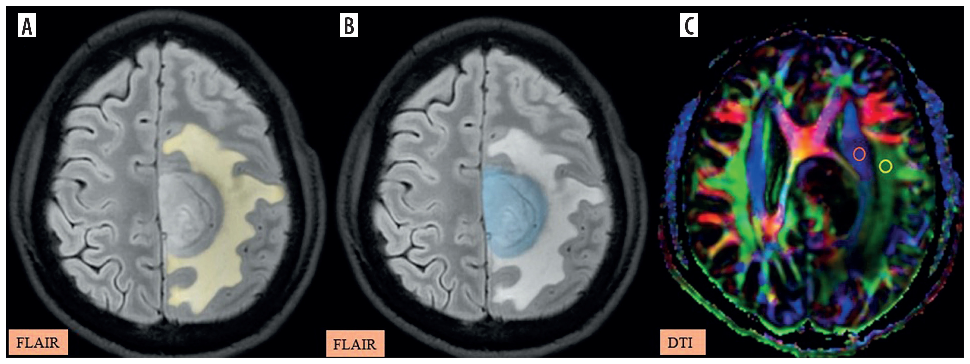 A-C) Patient with a low-grade glioma in the left frontal region presenting with headache and seizures. A) and B) Axial fluid-attenuated inversion recovery (FLAIR) images show the segmented peritumoral oedema (yellow) and tumour volume (blue). C) Image describing the calculation of the diffusion tensor image analysis along the perivascular space (DTI-ALPS) index using two regions of interest (ROIs) drawn within the projection (blue) and association (green) fibres in the left periventricular region