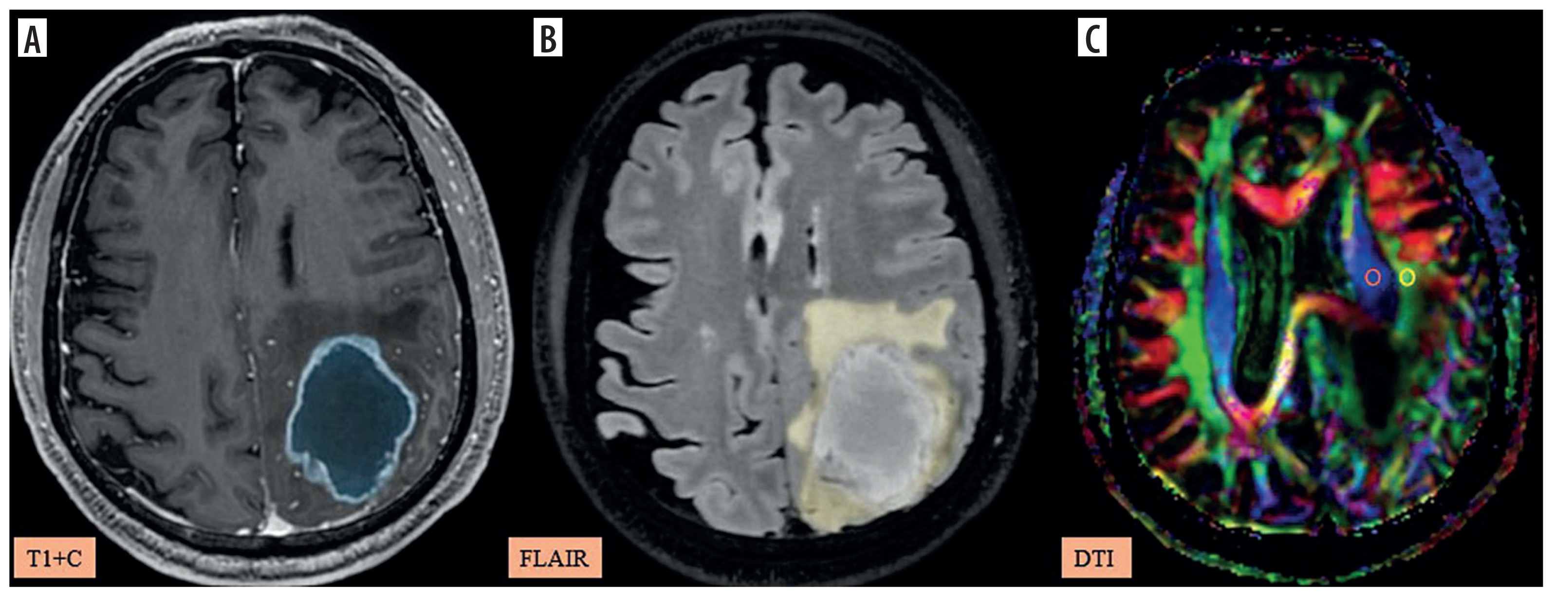 A-C) Patient with high-grade glioma in the left parietal region presenting with right-sided weakness. A) Axial post-contrast T1 image shows the segmented tumour volume (blue). B) Axial fluid-attenuated inversion recovery (FLAIR) image shows the segmented peritumoral oedema (yellow). C) Image describing the calculation of the diffusion tensor image analysis along the perivascular space (DTI-ALPS) index using two regions of interest (ROIs) drawn within the projection (blue) and association (green) fibres in the left periventricular region