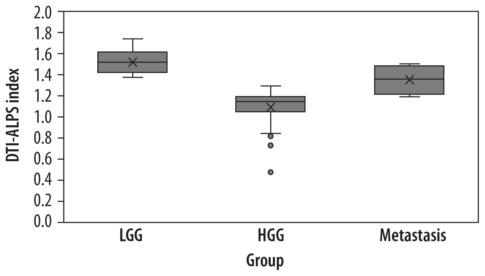 Box plot comparing the diffusion tensor image analysis along the perivascular space (DTI-ALPS) index across 3 groups – low-grade gliomas (LGG), high-grade gliomas (HGG), and metastases. Outliers in the HGG group are represented by grey dots