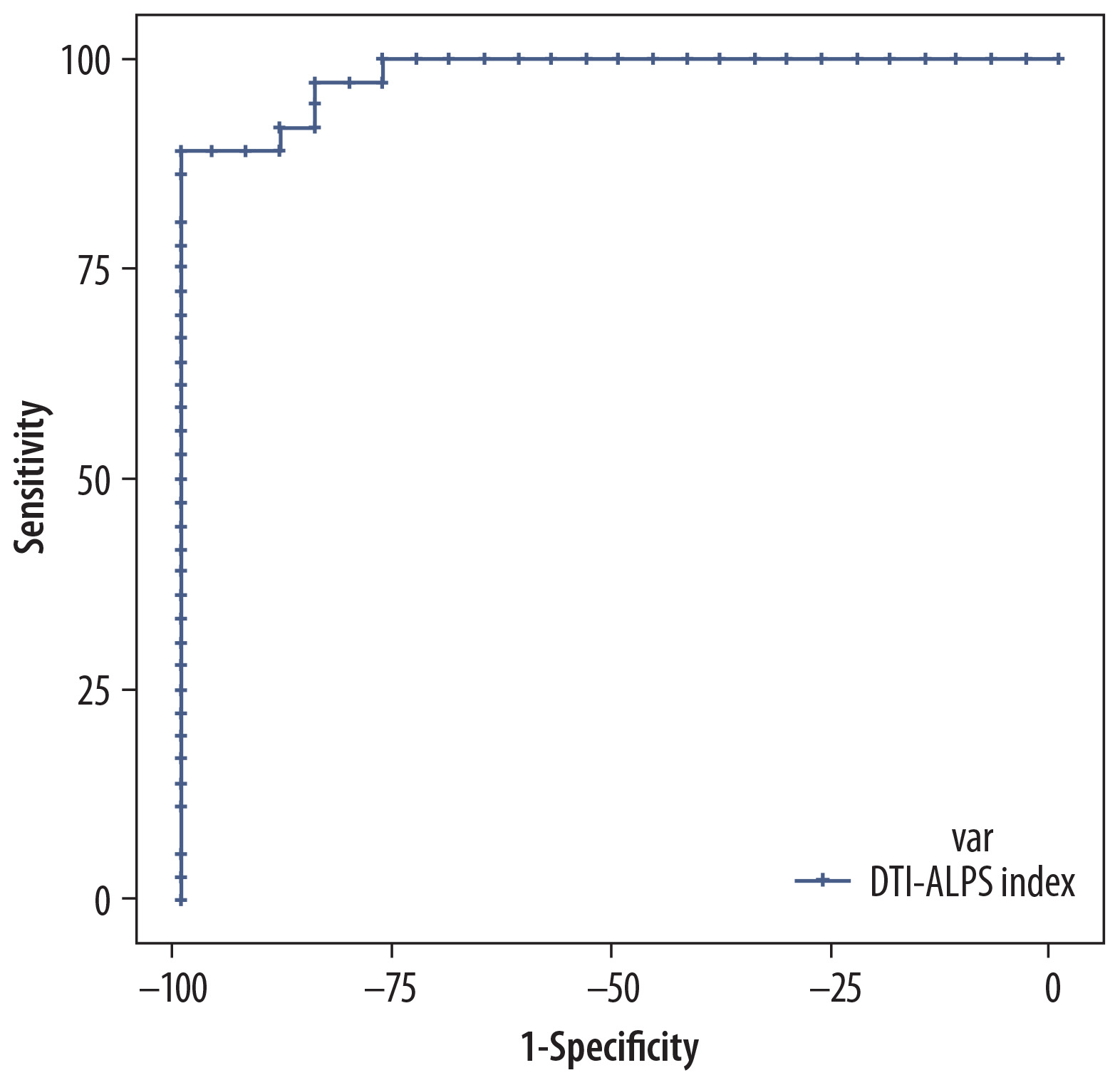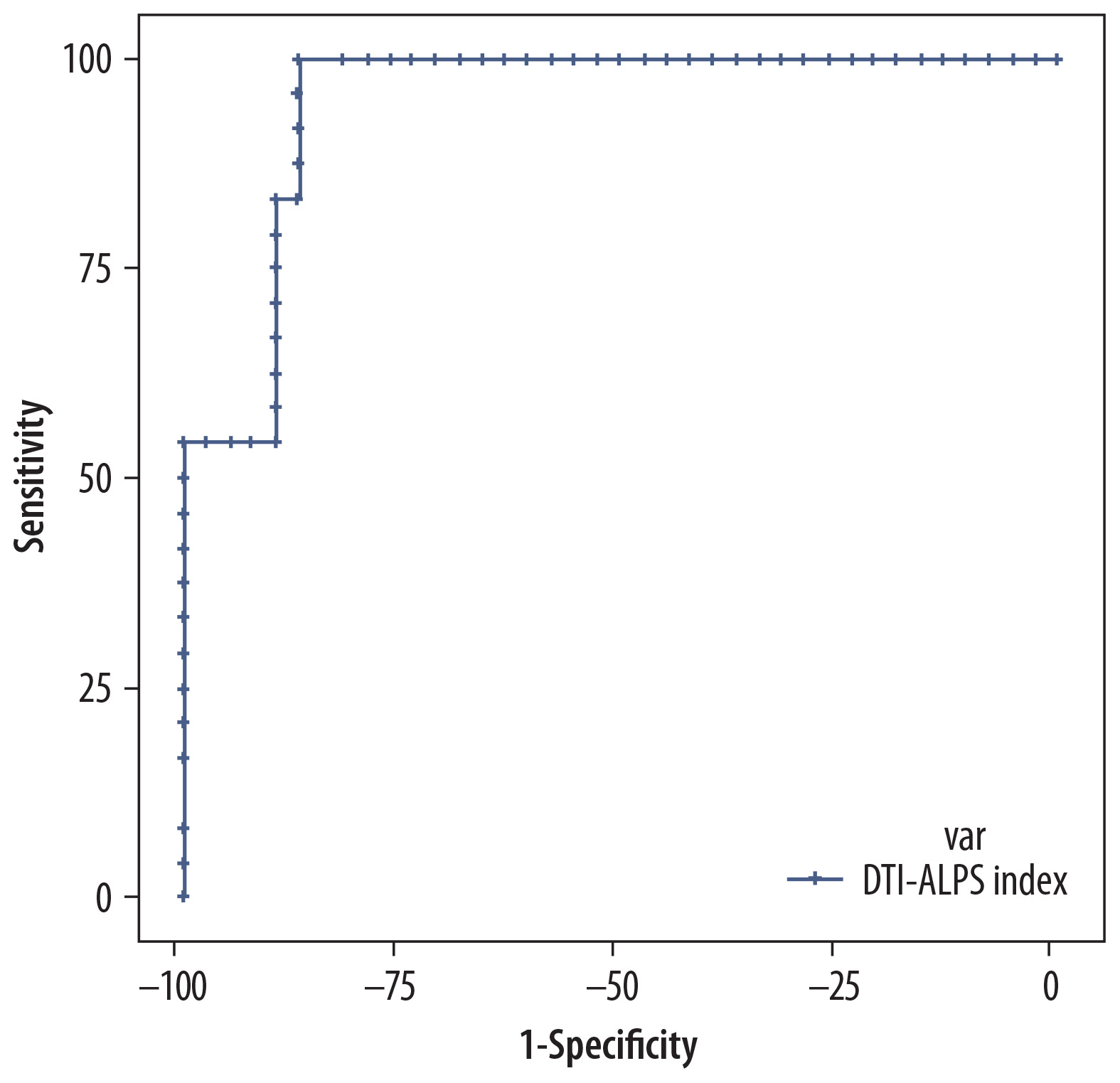 Receiver operating characteristic curve for the the diffusion tensor image analysis along the perivascular space (DTI-ALPS) index in the low-grade glioma (LGG) group, illustrating its diagnostic performance by plotting sensitivity against 1-specificity, showing excellent sensitivity and specificity for a cut-off of > 1.3838