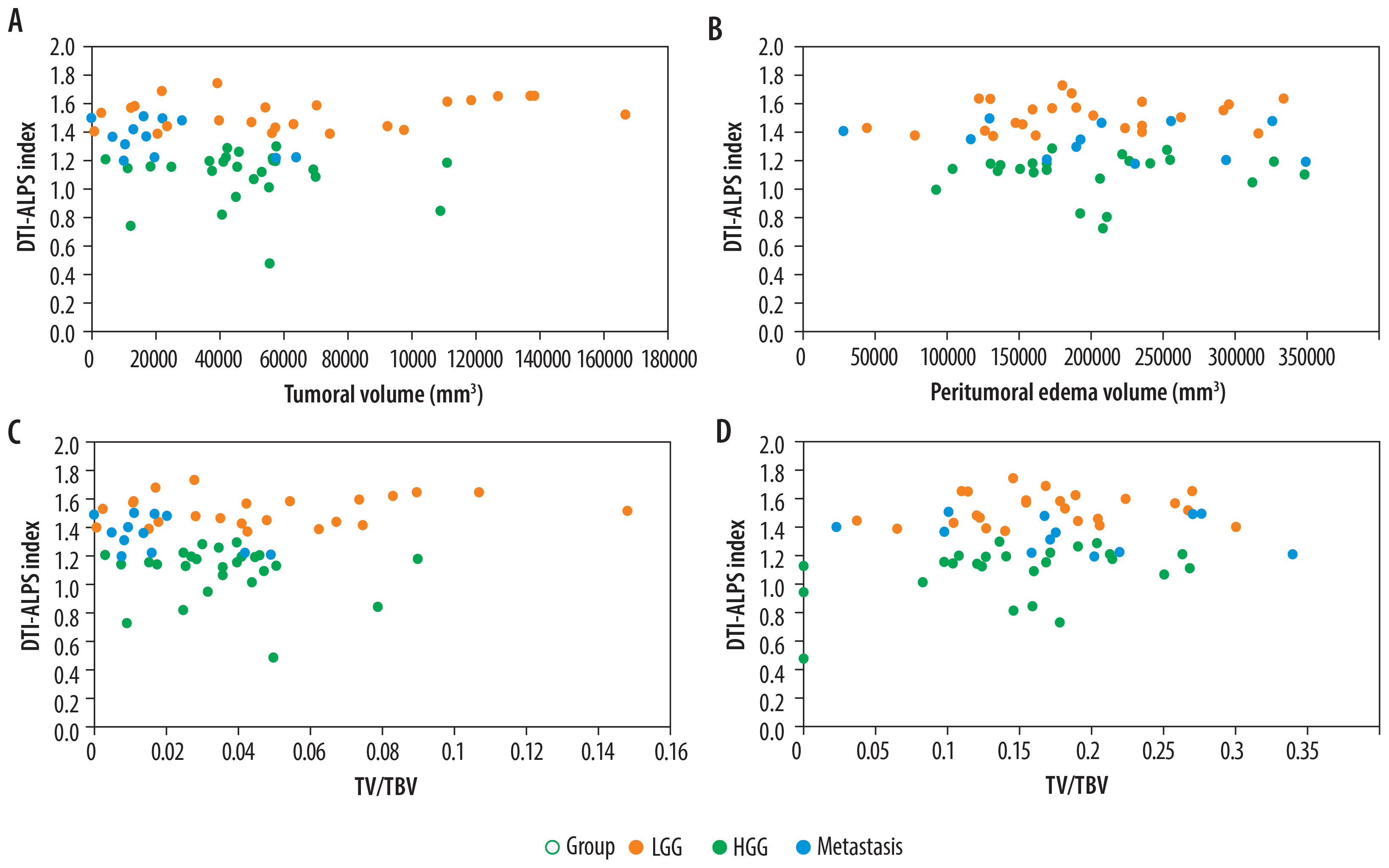 A-D) Scatter plot describing the relationship between the diffusion tensor image analysis along the perivascular space (DTI-ALPS) index and tumour volume (A), peritumoral oedema (B), the tumour volume-to-total brain volume ratio (TV/TBV) (C), and peritumoral oedema to tumour volume ratio (PTE/TBV) (D) across 3 tumour groups: low-grade glioma (LGG), high-grade glioma (HGG), and metastasis. No significant correlation is seen among these parameters