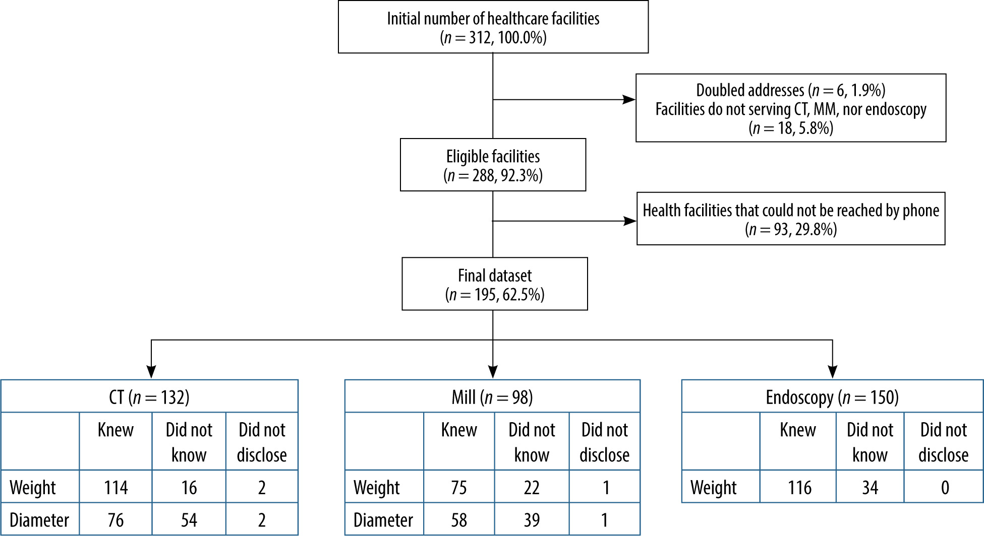 In the initial phase, we undertook a descriptive statistical analysis to ascertain the number of facilities aware of the maximum weight their CT, MRI, or endoscopy tables could accommodate. Additionally, for CT and MRI units, we assessed the maximum patient diameter the scanners could handle.