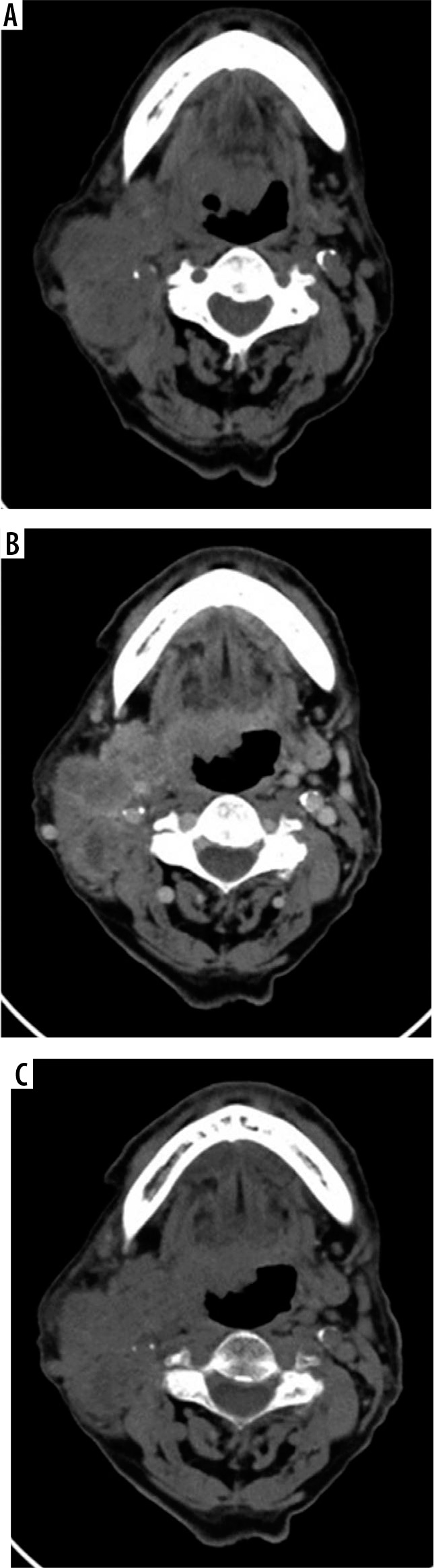 A 78-year-old woman with CA soft palate. A) Axial true noncontrast image was performed before intravenous contrast administration. B) Axial contrast-enhanced image was performed after intravenous contrast administration 70 seconds. C) Axial virtual non-contrast image was reconstructed due to iodine subtraction from the contrast-enhanced image by using postprocessing algorithms
