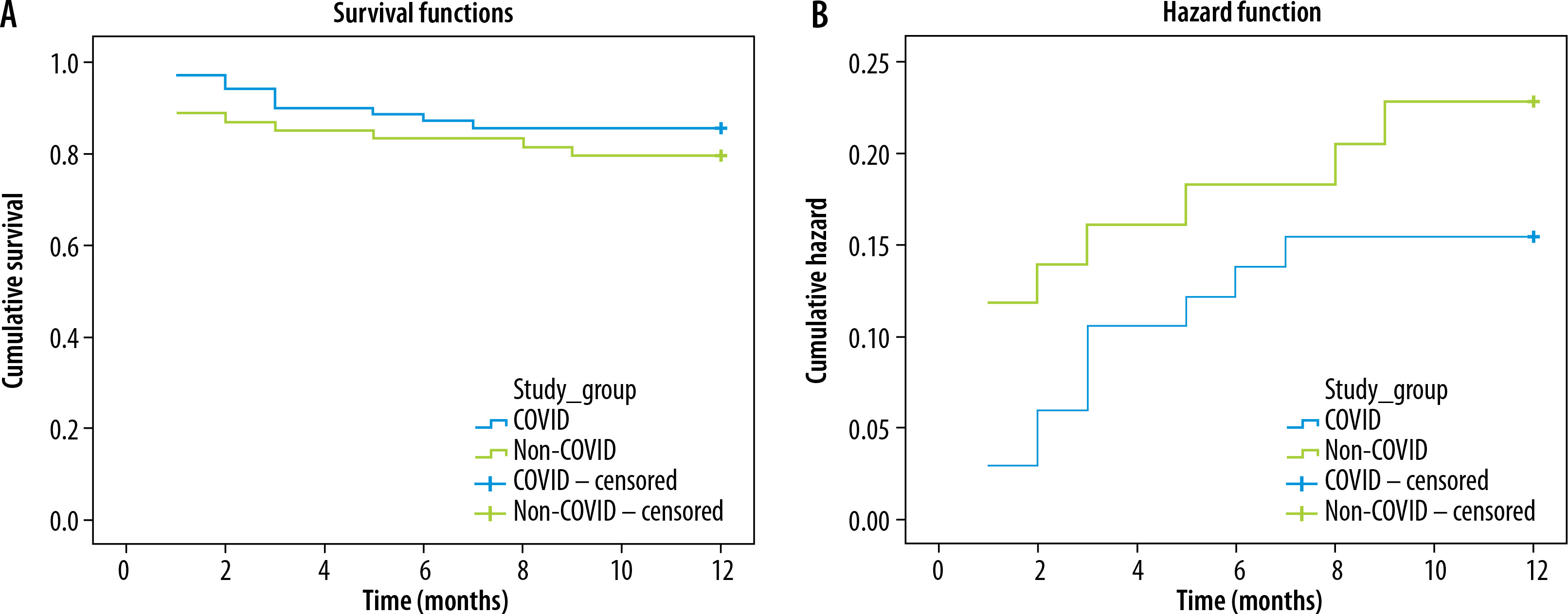 The mean event-free survival in the COVID group over one-year of follow-up was 10.7 (95% CI: 10.0-11.4), while in the non-COVID group it was 10.1 (95% CI: 9.1-11.1), showing no statistical significance (p = 0.353) (Figure 2).
