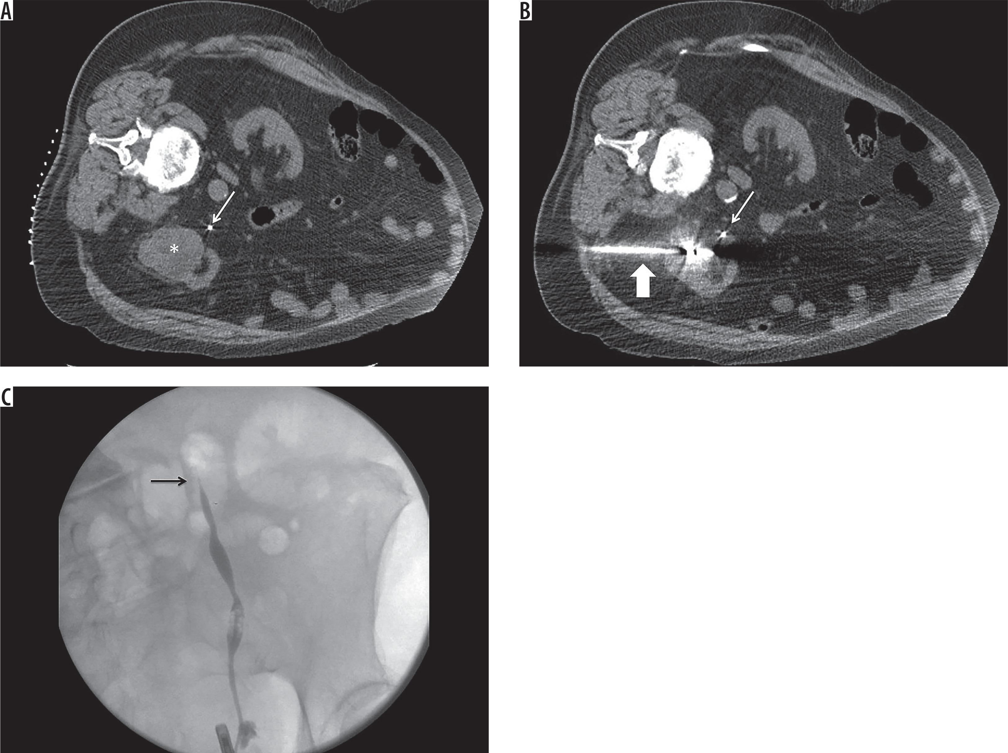 A) Axial unenhanced computed tomography (CT) scan of the abdomen at the time of ablation. Patient is in the left lateral decubitus position. White arrow indicates stent in the left ureter. White asterisk indicates renal cell carcinoma. B) Axial unenhanced CT scan of the abdomen at the time of ablation. Patient is in the left lateral decubitus position. White thin arrow indicates stent in the left ureter. White thick arrow indicates microwave ablation antenna. At the conclusion of the procedure, it was noted that the tubing connecting the bag of 0.9% normal saline to the ureteral stent became disconnected. As a result, it was likely that there was effective pyeloperfusion during treatment. C) Fluoroscopic images taken at the time of left retrograde pyelogram that demonstrate proximal ureteral stricture (black arrow)