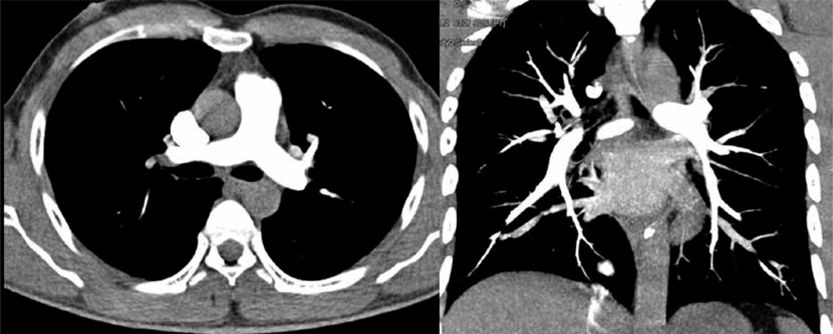 High-pitch PECG-gated CTPA in a 24-year-old male patient – axial and coronal images show uniform and dense opacification pulmonary arteries with quantitative enhancement in HU (MPA 396, right pulmonary artery 340, left pulmonary artery 354). Coronal image shows no intravascular shading (score 4) with visualization of subsegmental branches