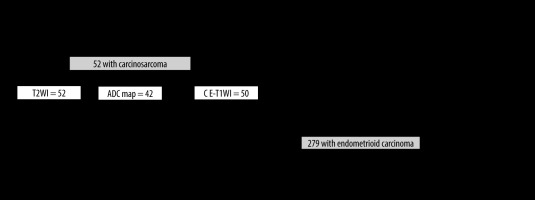 The inclusion criteria for the CS group were as follows: (a) pathologically proven CS by total hysterectomyand (b) a pelvic MRI in the oblique axial direction perpendicular to the long axis of the uterine body, performed at our hospital between January 2005 and December 2020. Note: Because CS is a rare tumour, cases of CS without diffusion-weighted imaging (DWI) or CE-T1WI were included. The inclusion criteria for the EC group were as follows: (a) pathologically proven EC by total hysterectomy and (b) a pelvic MRI including T2WI, DWI, and CE-T1WI in the oblique axial direction perpendicular to the long axis of the uterine body, performed at our hospital between January 2015 and December 2020. The exclusion criteria were as follows: (a) history of surgery other than caesarean section, chemotherapy, or radiation therapy of the uterus and (b) concomitant pregnancy. A flowchart for the patient selection process is shown in Figure 1.