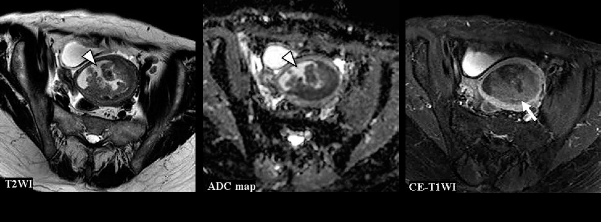 Because of sampling and biopsy errors due to the fact that carcinosarcoma contains various components, the preoperative radiologic diagnosis of CS is clinically important. This dia-gnosis guides optimal surgical planning and adjuvant therapy, including novel targeted immunotherapy [7]. According to previous studies investigating MRI findings of uterine CS, large exophytic (12-75%), heterogeneous endo-metrial masses both on T2-weighted imaging (T2WI) 71-82%) and T1-weighted imaging (T1WI) (18-50%) have been reported to be suggestive of CS [8-10]. In dynamic studies, CSs typically show areas of early and persistent marked enhancement (50-100%) [8-10]. However, despite significant differences in prognosis between CS and EC, MRI findings of CS are far from sufficient to distinguish them from EC, including the report by Bharwani et al. showing that 88% of CS were indistinguishable from EC [8].