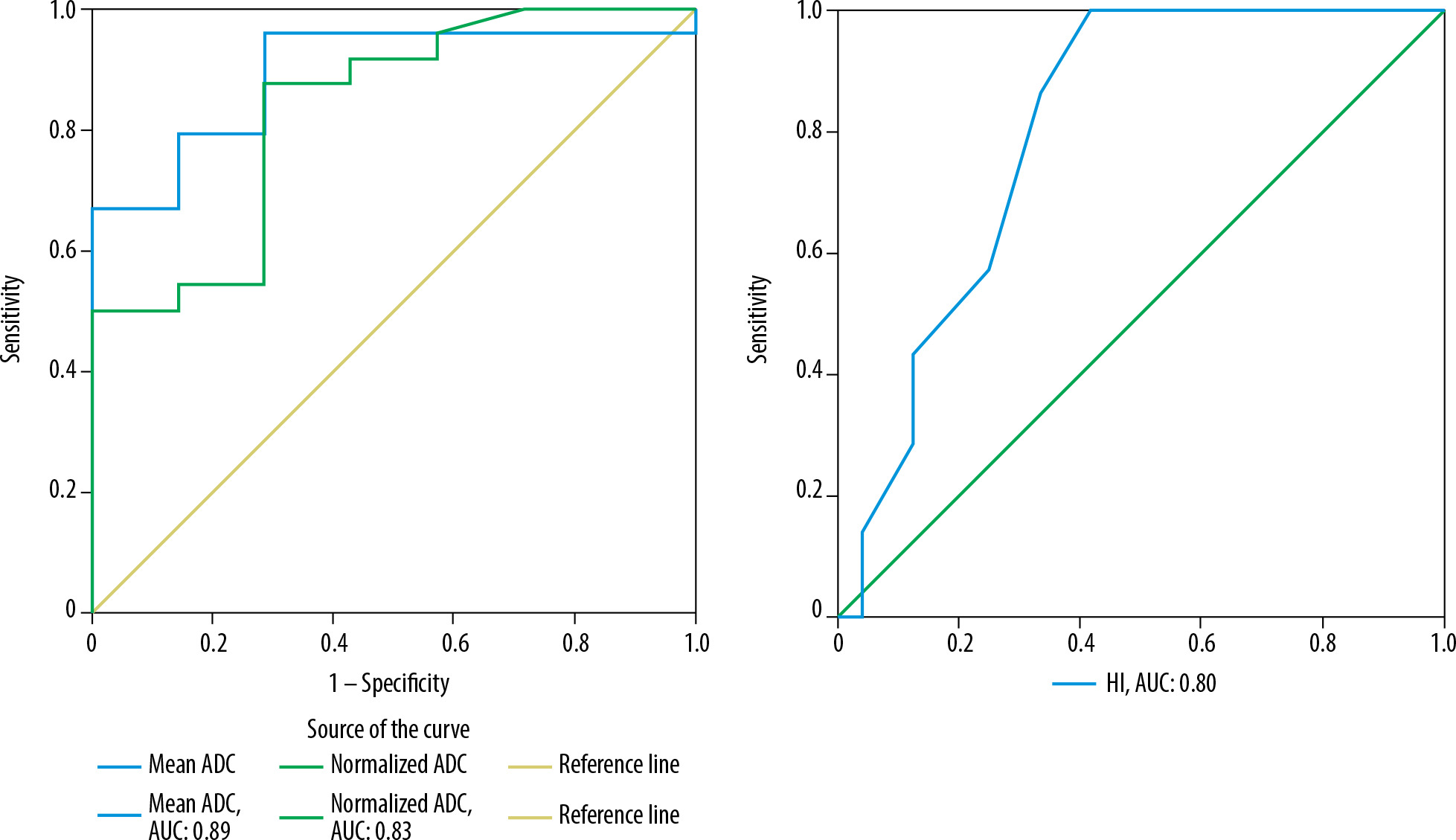 Using ROC curve analysis (Figures 2 and 3), cut-off values and sensitivity, specificity, accuracy, PPV, and NPV of mean ADC, normalized ADC and HI were determined for predicting pleomorphic adenomas and Warthin tumours, as summarized in Tables 5 and 6, respectively. Amongst DWI parameters, mean ADC showed the maximum area under the curve (AUC) for predicting pleomorphic adenomas (AUC: 0.95) as well as Warthin tumours (AUC: 0.89).