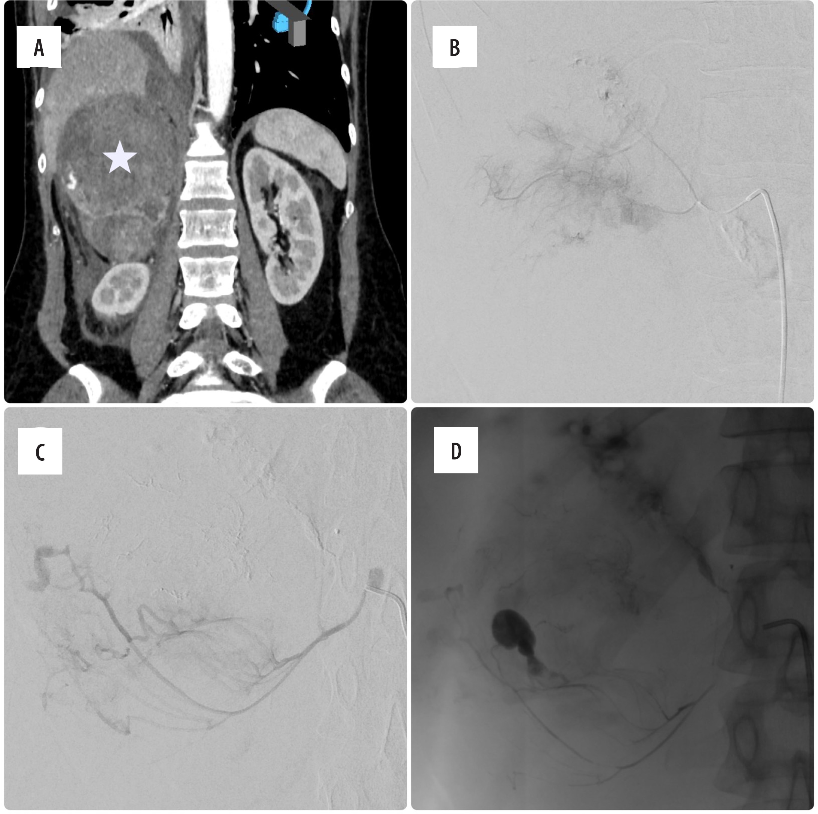 Embolisation procedure in a 67-year-old male patient with metastatic lesion in a right adrenal gland originating from lung cancer with signs of haemodynamic instability due to haemorrhage. A) Baseline contrast-enhanced CT disclosed large right-sided lesion in an adrenal gland (white star) with visible contrast extravasation in the lower part. Intraprocedural contrast injection showed extraluminal blush (B), and signs of contrast extravasation (C) suggestive of active bleeding from upper and middle adrenal arteries. D) Control imaging obtained after embolisation with glue showed successful exclusion of the culprit vessels