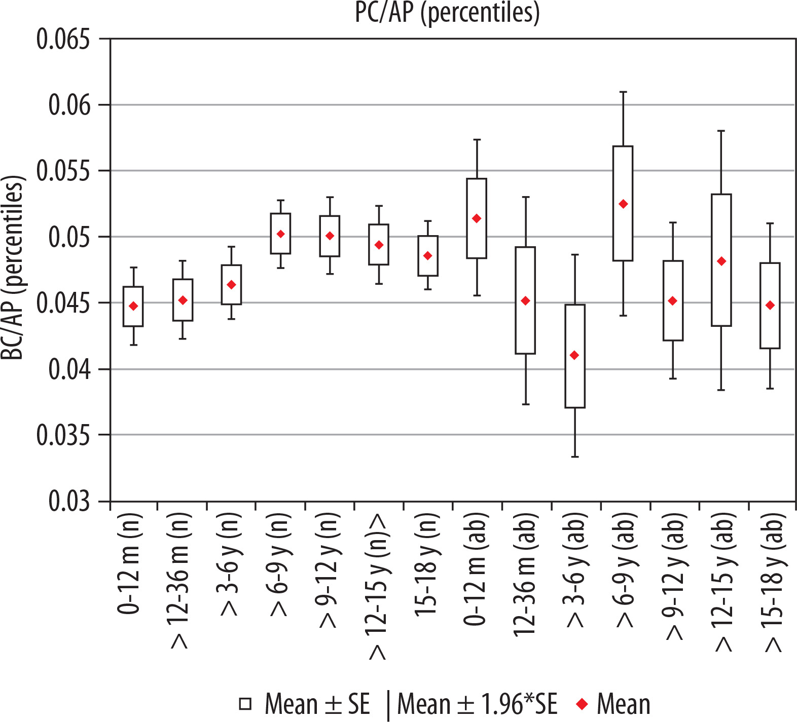 Mean values distribution of the basal cistern sagittal dimension index to the size of the skull, in particular age groups - Group I (from 0-12 m (n) to 15-18 y (n)) and Group II (from 0-12 m (ab) to 15-18 y (ab)) with confidence levels for each group