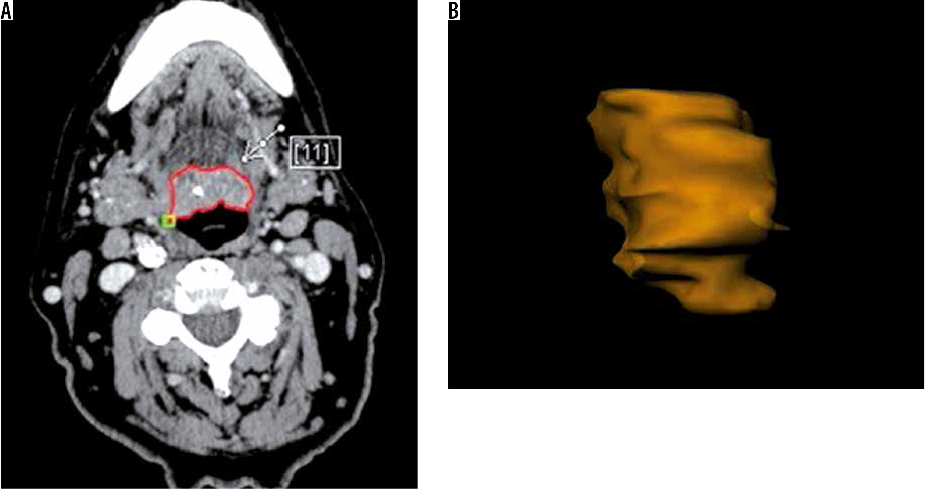 Oropharyngeal squamous cell carcinoma (OPSCC) has shown increasing incidence in recent decades due to an increase of human papillomavirus (HPV) distribution, especially among younger people. HPV-positive OPSCC cases now account for 70% of newly diagnosed OPSCCs in the United States of America [1]. Patients with a first diagnosis of oropharynx carcinoma often present with a locally advanced and surgically unresectable disease. But can tumour volume be an important pre-treatment parameter, like traditional TNM staging? Not only can the gross tumor volume (GTV) of oropharynx carcinomas be a pre-treatment parameter, but also three-dimensional images of OPSCC. In a clinical study [2] more accurate tumour volume estimation was shown to be an additional predictor between conventional radiotherapy (RT) alone, modern, highly conformal RT techniques, or more aggressive, combined treatment. Despite the fact that the eighth version of American Joint Committee on Cancer – Union for International Cancer Control (AJCC – UICC) does not use the GTV, we think that radiologists should report tumour volume in their conclusions. The idea of correlation between the GTV and the radiotherapy outcome is not new. The eighth edition reviewed staging system of oropharyngeal squamous cell carcinoma (TNM-System) from 2017 distinguishes between HPV-16-negative and HPV-16-positive tumours of the oropharynx. Today oropharyngeal cancers are treated with chemoradiation or first with surgery followed by radiation or chemoradiation. However, in our institute the management of OPSCC is performed in a multidisciplinary tumour board setting. The choice of the right treatment can be complex. After an internal tumour board decision for radiation therapy, our patients are addressed to an external Institute of Radiotherapy, where patients underwent intensity-modulated radiation therapy (IMRT) or volumetric modulated arc therapy (VMAT). GTV can predict local control at different head and neck subsites, and local recurrence is higher in large-volume tumours than in low-volume lesions arising in the same anatomic subsite [3-7]. Tumour volume and tumour response to RT have a profound influence on the dose required to control a given type of tumour, as well as other factors: the large number of stem cells which must be sterilised, intrinsic radio sensitivity, repair, rate of repopulation/regeneration during therapy, reoxygenation, and redistribution. Tumour control can be influenced by other mechanisms such as biological heterogeneity as the number of clonogenic stem cells, tumour microenvironment, or inter-cellular communication and genetic factors. An important factor influencing the RT outcome of patients with various types of tumours, including head and neck cancers, is that the clonogen number increases linearly with the tumour volume (TV) [8]. The TNM classification system for head and neck cancer incorporate only linear dimensions for a few tumour localisations. In the past, a two-dimensional approach in daily clinical practice or in measurement of TV or variations of TV are in use. Today, modern radiation oncology can precisely sculpt the radiation dose to target volumes while sparing multiple critical normal tissues such as the brainstem, optic chiasm, optic nerves, and the spinal cord.