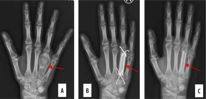 Reinsertion of ulnar collateral ligament of the thumb with the usage of soft mini anchor. A) Anchor in the base of the proximal phalanx (blue arrow), torn ligament (red arrow), examples of soft (B) and titanium (C) implants