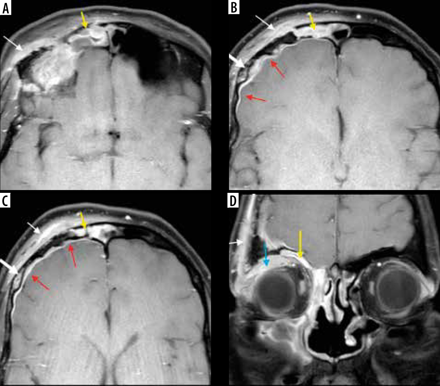 Frontal bone osteomyelitis in a patient with COVID-related right frontal mucormycosis. Axial (A-C) and coronal (D) post-contrast fat-suppressed (FS) T1-weighted (T1W) images demonstrate right frontal sinusitis (yellow arrows). The anterior and lateral aspects of the frontal bone demonstrate signal abnormality (thick white arrow) with an overlying enhancing subperiosteal collection on the right side (thin white arrows). Adjacent pachy-meningeal thickening, enhancement in the right frontal region (red arrows). Intra-orbital, extra-conal extension of the disease process noted along the supero-lateral aspect of the right orbit (blue arrow)