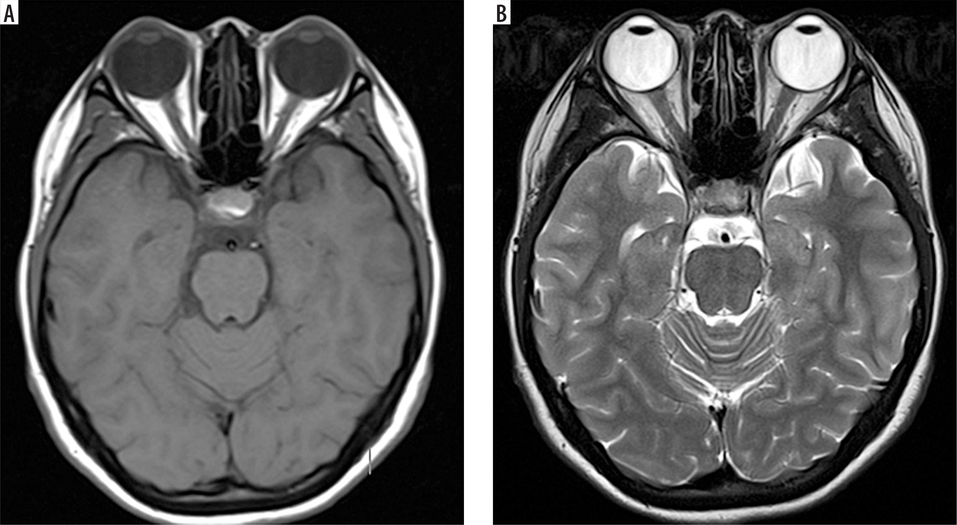 Axial section of normal brain MRI. A) T1-weighted MRI image – note how CSF and vitreous humour appear dark. B) T2-weighted MRI image – note how CSF and vitreous humour are bright. Recognising these normal signal intensities is essential for accurately identifying pathological changes or surgical planning [Courtesy: Radiopaedia. DOI: https://doi.org/10.53347/rID-153576, rID: 153576]