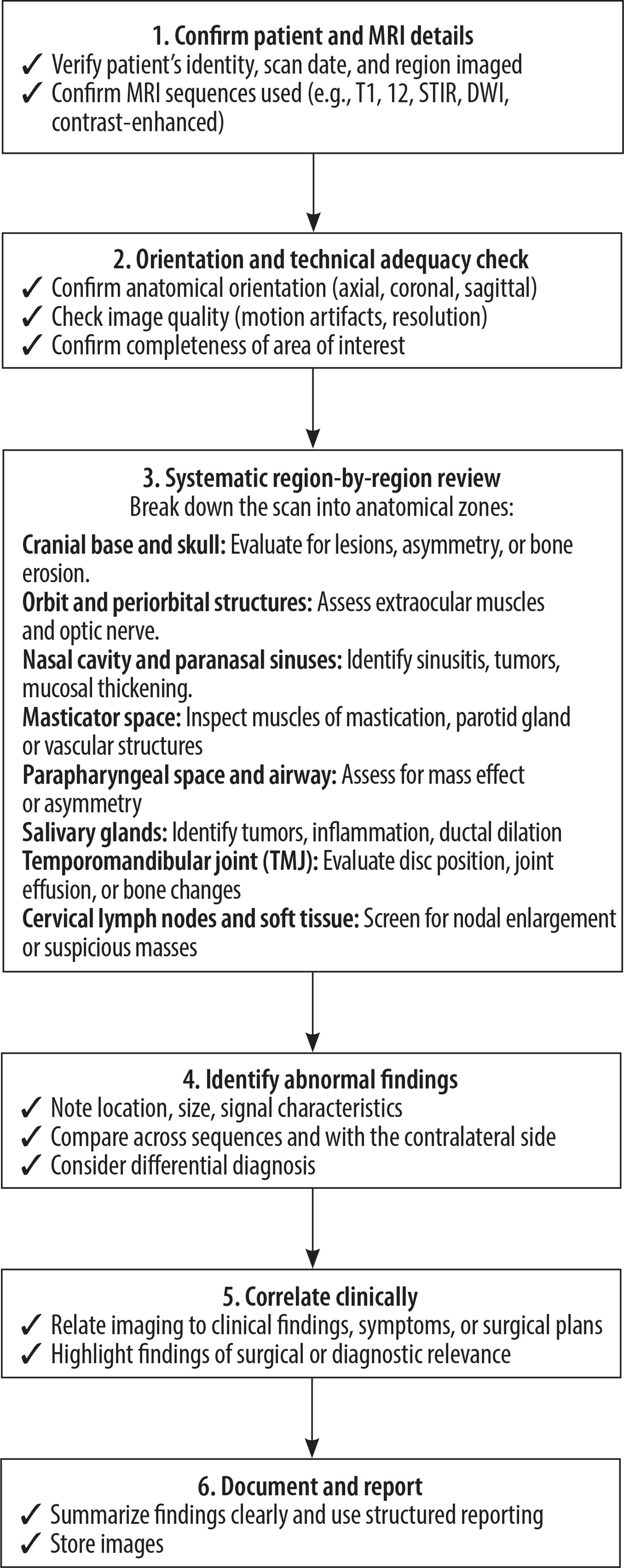 MRI interpretation of the head and neck region can be complex due to the anatomical density and diversity of structures. A structured approach ensures a systematic, reproducible, and clinically meaningful evaluation. This is particularly important for OMFS trainees, who must integrate radiological findings with clinical and surgical decision-making. A step-by-step MRI interpretation framework for OMFS is illustrated in the flowchart shown in Figure 3, providing a systematic approach to reviewing head and neck scans.