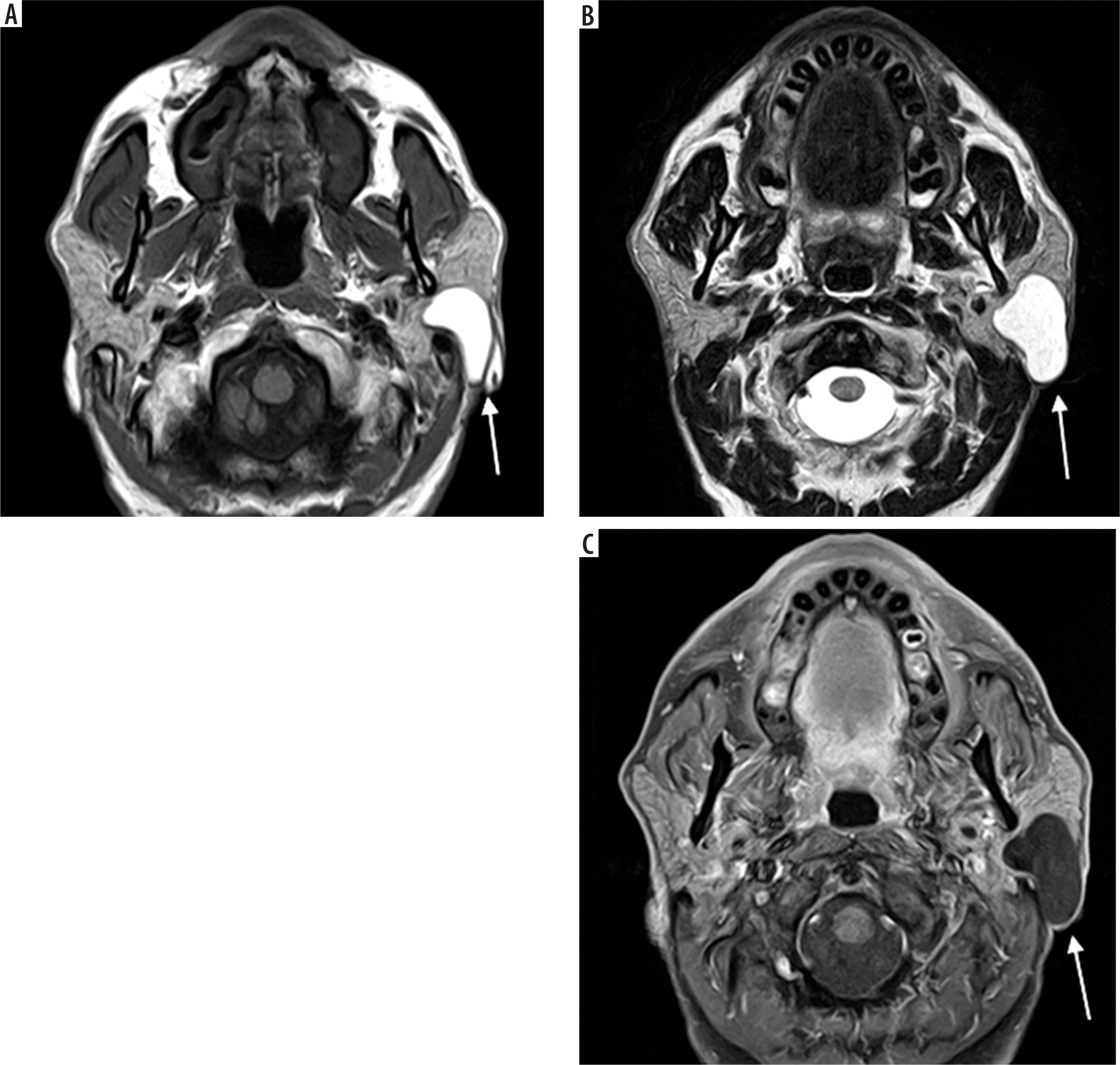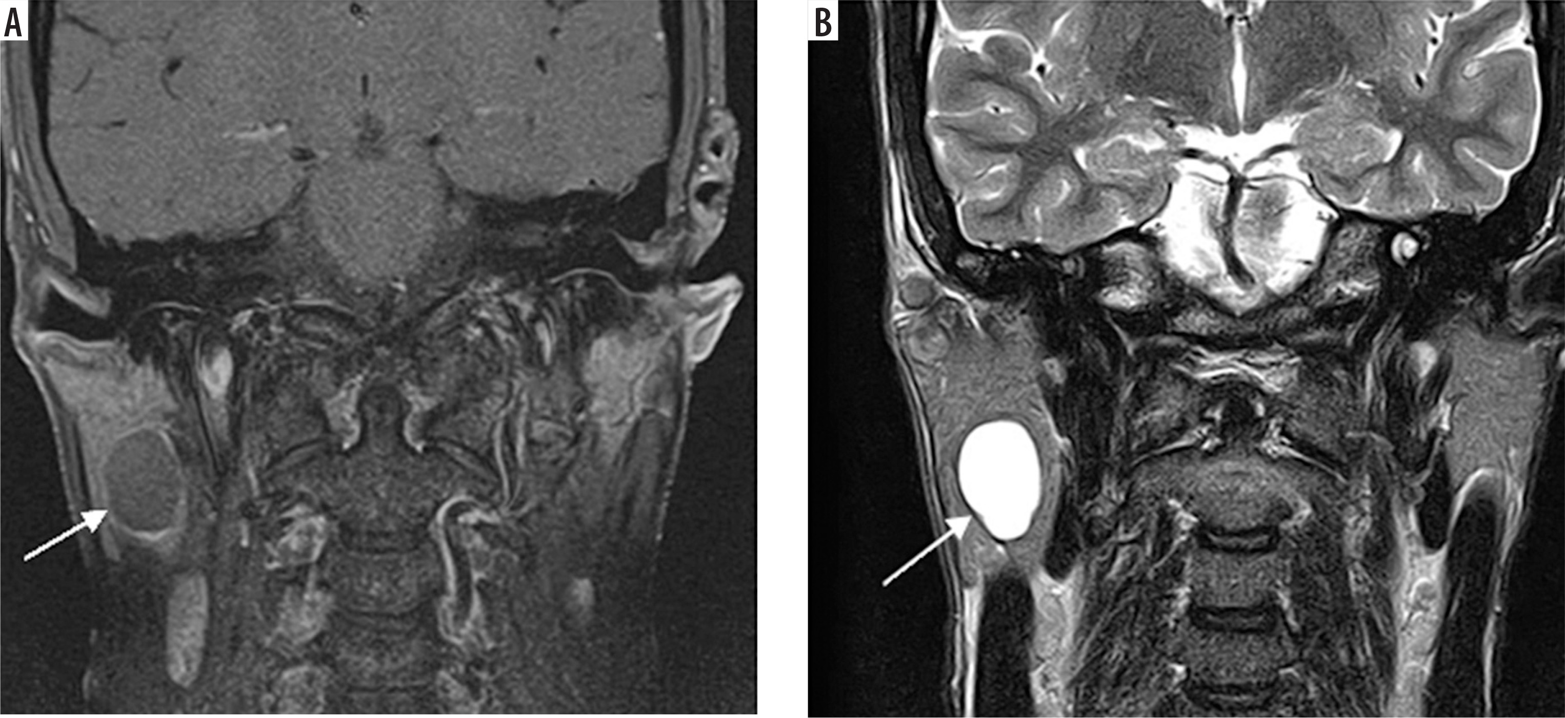 A 30-year-old male patient presented with painless swelling of the right parotid region. Coronal section of MRI shows a right parotid lymphoepithelial cyst. Cystic lesion with water content has low signal intensity on T1-weighted images, hence appears hypointense. In contrast, it has high signal intensity on T2-weighted images and has hyperintense appearance (Figures 4A-C).