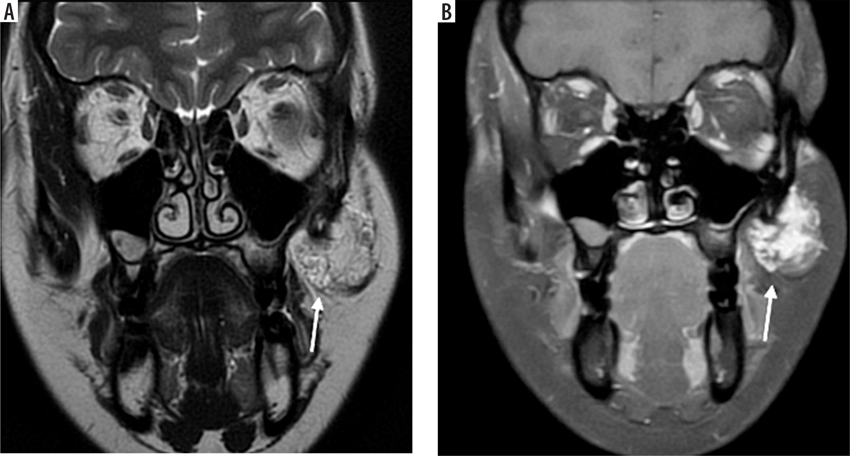 Coronal section of MRI of facial haemangioma: A) T2-weighted , B) T1 C+ Fat sat. These imaging features help confirm the vascular nature of the lesion, which is critical for surgical planning to minimise intraoperative bleeding and preserve surrounding structures [Courtesy: Radiopaedia. DOI: https://doi.org/10.53347/rID-81554, rID: 81554]
