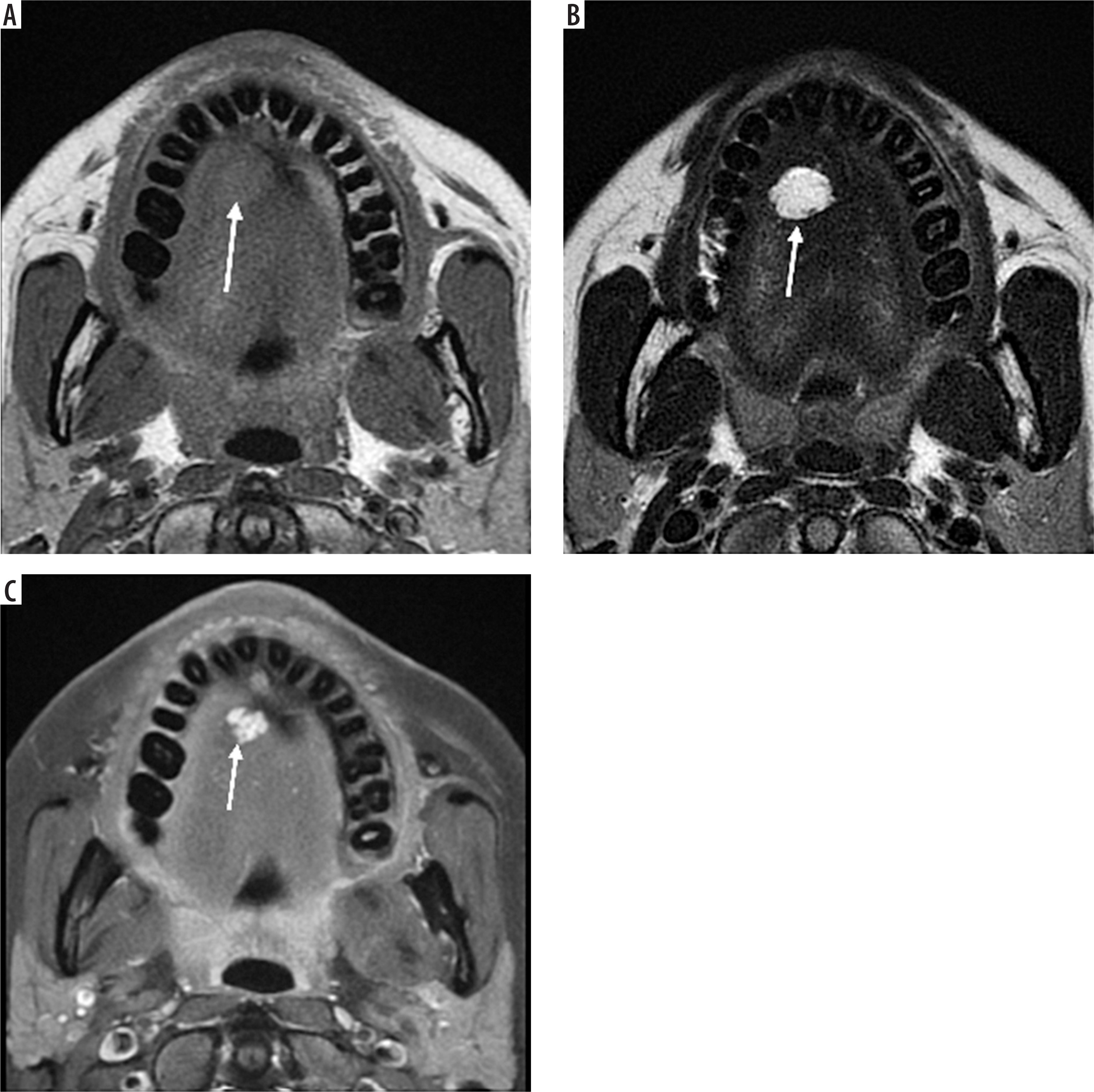 Axial section of MRI of tongue haemangioma: A) T1-weighted, B) T2-weighted, C) T1 C+ Fat sat. These findings are essential for distinguishing haemangioma from other tongue masses and for assessing lesion extent and vascularity, which is critical for safe surgical excision and functional preservation [Courtesy: Radiopaedia. DOI: https://doi.org/10.53347/rID-84386, rID: 84386]