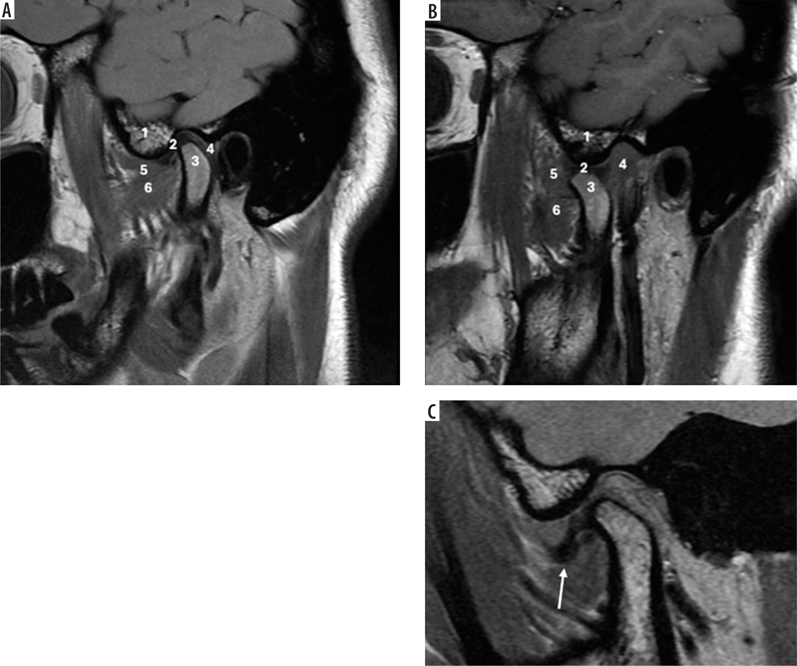 Sagittal view of T1-weighted MRI images. A) Normal TMJ in closed position, B) normal TMJ in opened position C) anterior disk displacement without reduction. 1, articular eminence, 2, intermediate band of articular disk, 3, mandibular condyle, 4, retrodiscal tissue, 5 and 6 superior and inferior bellies of the lateral pterygoid muscle. Identifying internal derangements of the TMJ is crucial for accurate diagnosis and for planning both conservative and surgical interventions in TMJ disorders. [Figure 7A and 7B, Courtesy: Radiopaedia. DOI: https://doi.org/10.53347/rID-2748, rID: 2748; Figure 7C, Courtesy: Radiopaedia. DOI: https://doi.org/10.53347/rID-66812, rID: 66812]