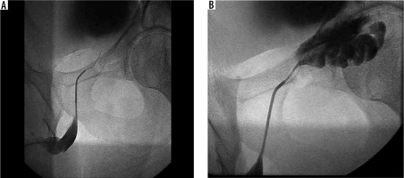 A 28-year-old man, surgically treated 2 years previously for clinical grade III bilateral varicocele (according to Dubin’s classification) who had not conceived for 16 months despite regular and unprotected sexual intercourse, was admitted to the Urology Department for suspected accidental surgical ligation of the left vas deferens. The spermiogram exhibited showed moderate oligospermia (7 million/ml) without evidence of teratospermia and asthenospermia. The hormonal dosage of FSH, LH, GnRH, prolactin, and total and free testosterone was normal. Liver, kidney, cardiological, and blood count tests were negative. The physical examination showed didymes and epididymes in place, not painful, and mobile. US confirmed the regular volume and echostructure of didymes and epididymis. Scrotal tunics were not thickened. There was no hydrocele. The proximal deferens bilaterally were not delated. In colour Doppler, the intratesticular vascularization was regular. Pathological reflux was not observed after Valsalva test in the anterior pampiniform plexus bilaterally although residual ectasia of the venous calibre (d.a.p. max 3 mm) was found especially on the left. In agreement with the urologist, we decided to perform a phlebography of the left pampiniform plexus, which confirmed the presence of the residual venous ectasia. Subsequently, bilateral vesico-deferentography was performed, which showed regular diameter, course, and patency of the vas deferens. The seminal vesicles were highly dilated, especially on the left due to steno-occlusion of the ejaculatory ducts; therefore, H2O gas insufflation was carried out with modest results, and the treatment was rescheduled. After 45 days, the patient exhibited a spermiogram, which showed severe oligospermia (1.5 million/ml) without alterations in the shape and motility of the spermatozoa. In agreement with the urologist, we decided to perform a combined treatment. Preliminarily, urethroscopy was performed, thus identifying the verumontanum and then selectively catheterizing the ejaculatory ducts through micro-catheter and H2O insufflation was performed with complete unblocking of the orifices. The spermiogram performed at 90 days was negative with a sperm count of 50 million/ml. Currently the patient is in excellent clinical condition and undergoes ultrasound control and annual spermiogram.