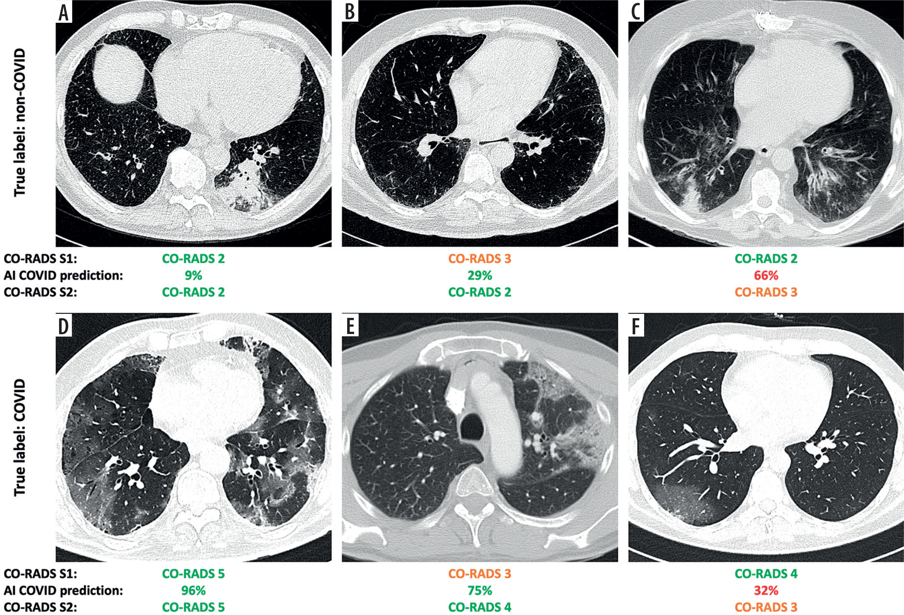 Representative cases illustrating different outcomes in the classification of respiratory viral pneumonias with the aid of an artificial intelligence (AI)-based classifier. For each case, the radiologist-assigned COVID-19 Reporting and Data System (CO-RADS) score is reported before (S1) and after (S2) reviewing the AI-generated COVID-19 probability. In cases where initial uncertainty (S1) was present, AI support often helped resolve the doubt. Conversely, in initially confident assessments, AI input occasionally introduced new uncertainty. The examples shown include pneumonias caused by (A) rhinovirus, (B) human coronavirus NL63 (HCoV-NL63), (C) parainfluenza virus type 3 (PIV3), and (D-F) SARS-CoV-2 infection