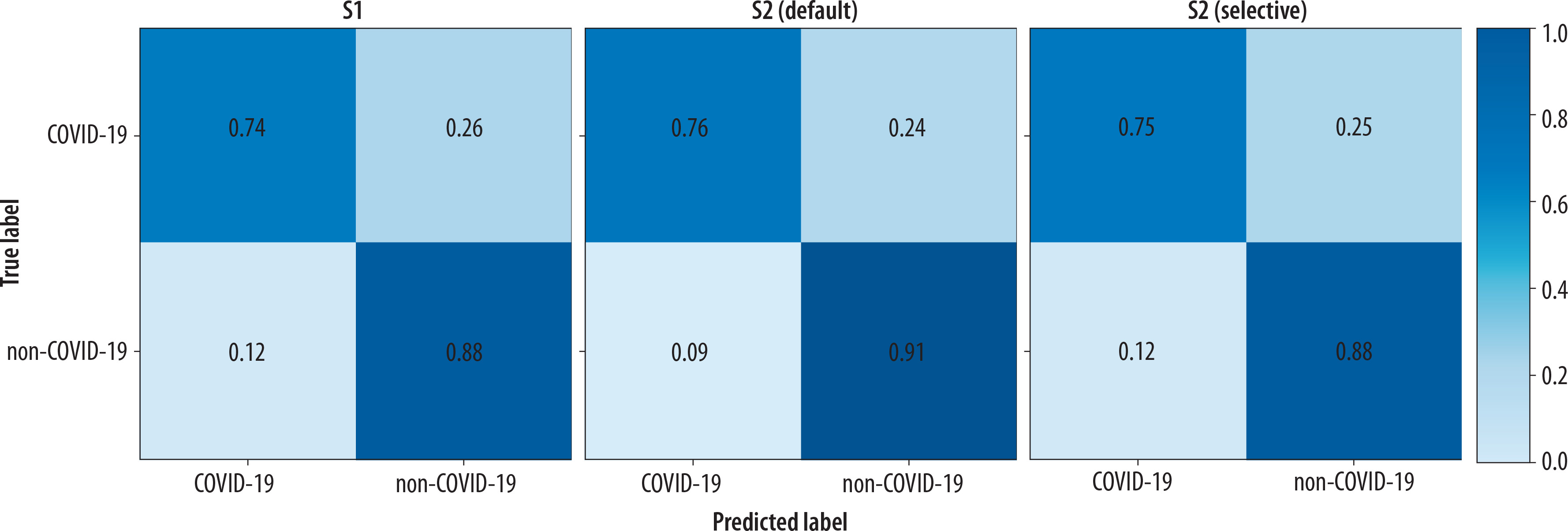The CO-RADS scores assigned by each reader in S1 and in S2, considering both the default and selective approaches, are presented in Table 2.