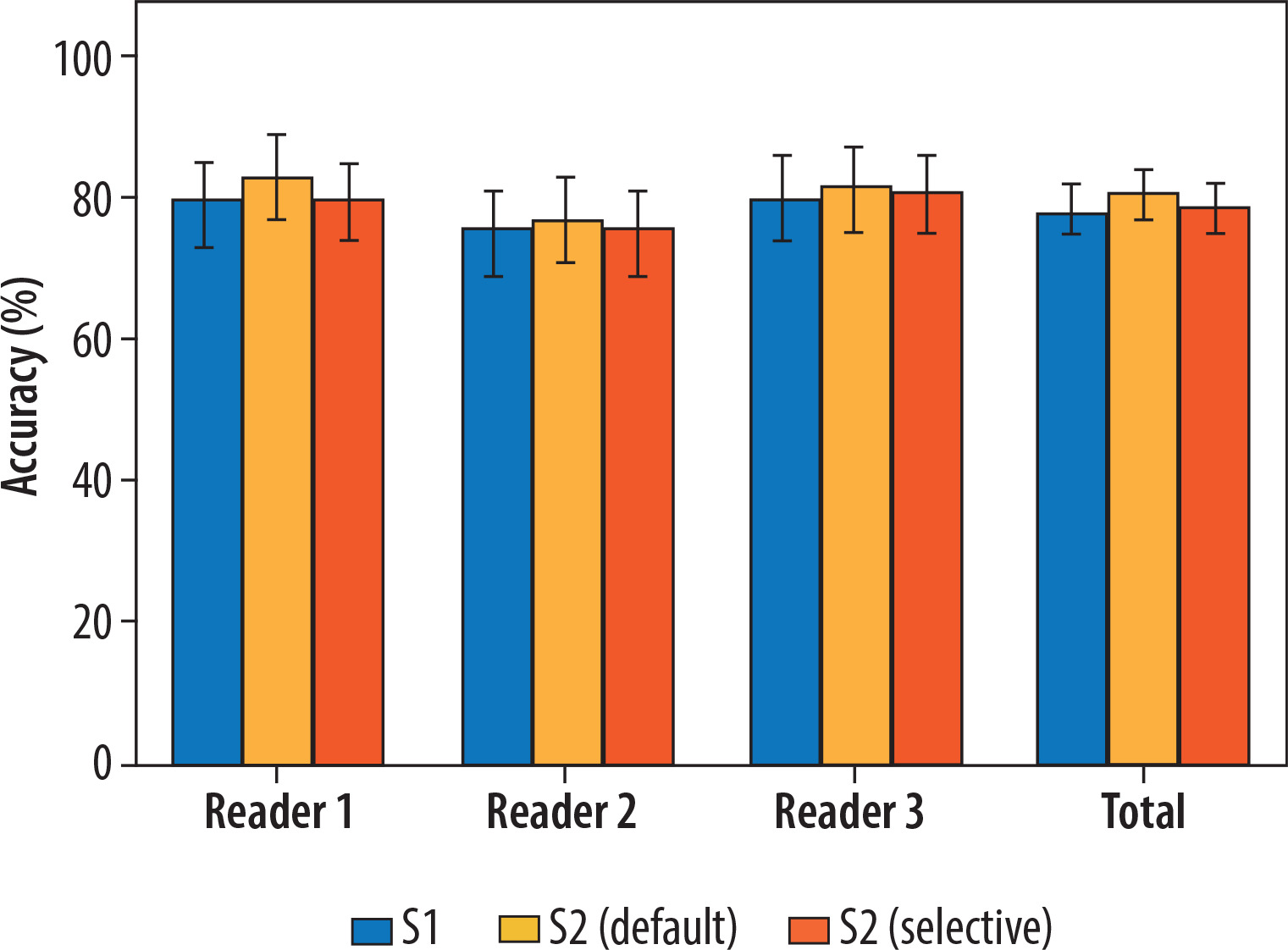 Comparison between the accuracy of the 3 readers before (S1) and after (S2) receiving the artificial intelligence classifier results, under both the default and selective approaches