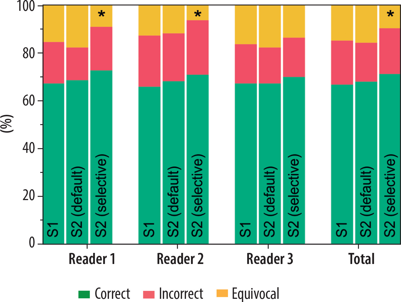 Comparison of the distribution of correct, incorrect, and equivocal cases among the 3 readers before (S1) and after (S2) receiving the artificial intelligence classifier results, under both the default and selective approaches. The asterisks indicate classes that show significant differences from the others (p < 0.009)
