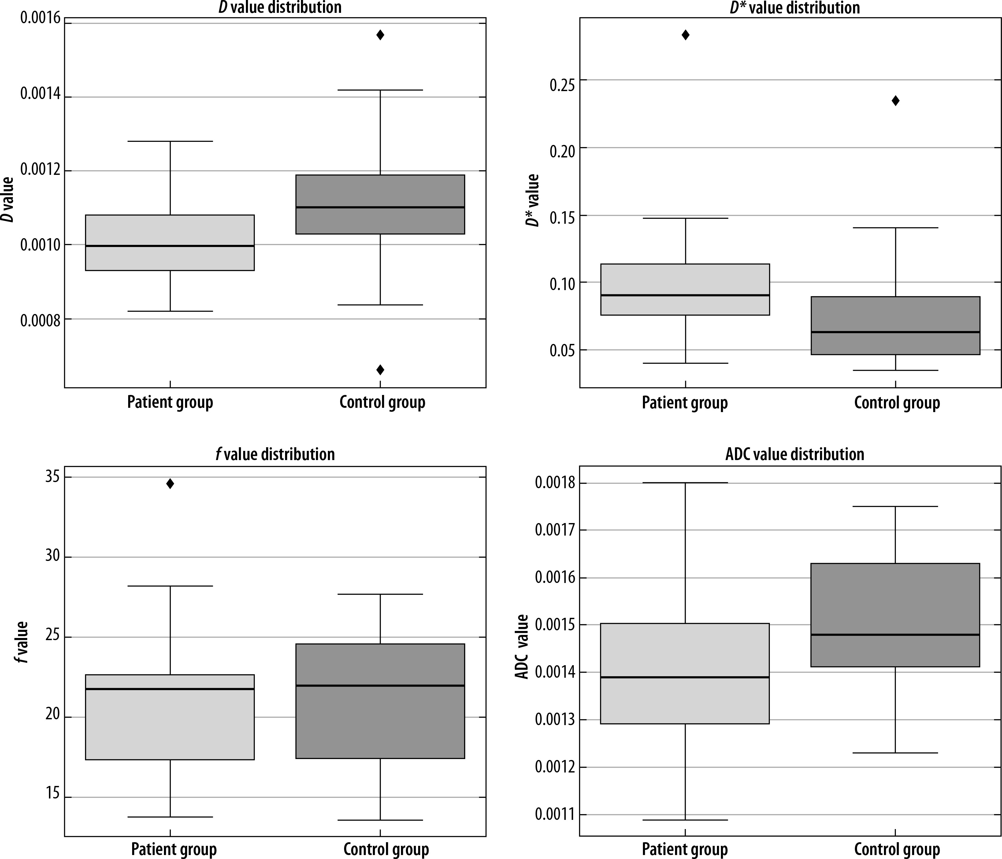 Initially, in the analysis between the patient and control groups, the D value was found to be significantly lower (p = 0.001; p < 0.05) whereas the D* value was significantly higher in the patient group than in the control group’s (p = 0.001; p < 0.05) (Figure 3). No statistically significant difference in the f value was found between the 2 groups (p > 0.05). Additionally, the ADC value in the patient group was significantly lower compared to the control group (p = 0.001; p < 0.05). Significant differences were found for D, ADC, and D*, but no significant difference was observed for the f parameter (Table 1).