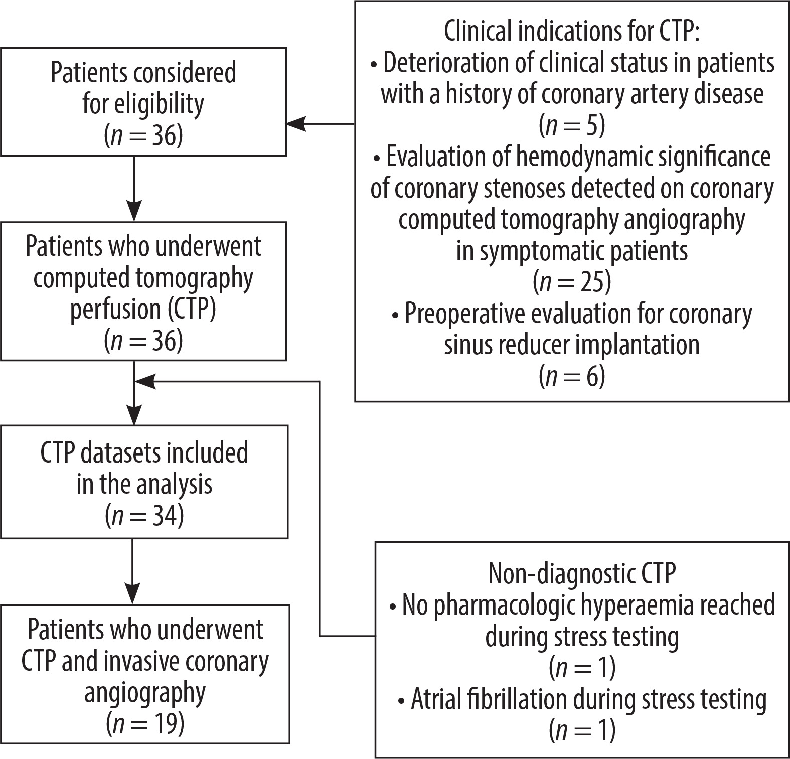 Of the 36 patients enrolled, 24 underwent CCTA at our institution. In 10 cases, CCTA datasets were acquired externally and therefore excluded. Nineteen patients underwent both comprehensive cardiac CT (CCTA and CTP) and ICA within a mean interval of 1 month (range: 0-3 months) and were included in the final analysis.