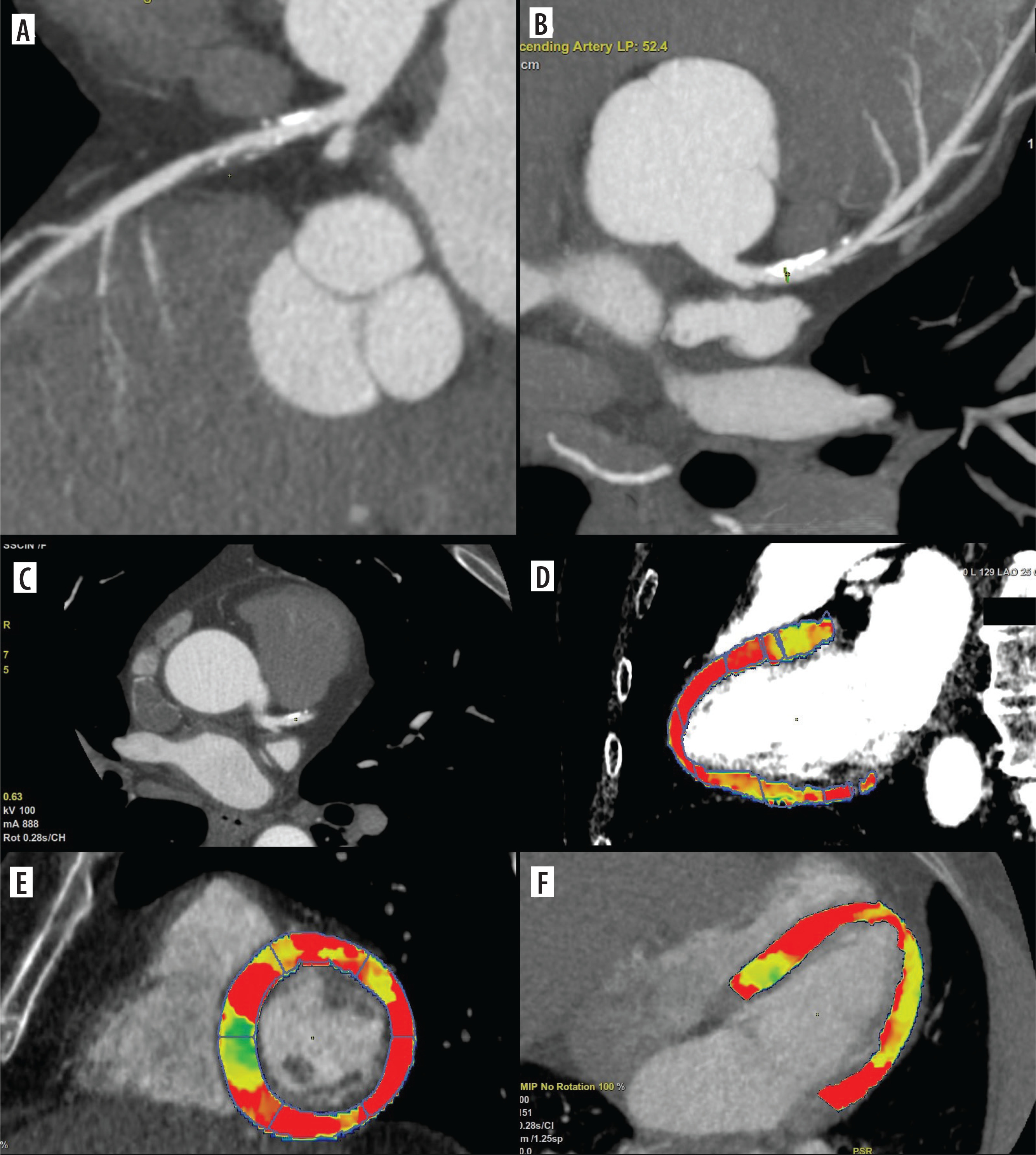 Coronary computed tomography angiography (CCTA) and dynamic computed tomography perfusion (CTP) scans from a 58-year-old male with a history of reduced exercise tolerance and shortness of breath. The patient underwent a comprehensive CT evaluation, including calcium scoring, CCTA, and dynamic stress CTP. The calcium score was 228 AU (80 mm3), consistent with moderate calcification (CAC-DRS A2 N2). Coronary CT angiography identified a 60-70% stenosis in the proximal-to-mid left anterior descending artery (LAD) (A-C). Dynamic stress CTP with regadenoson revealed reduced blood flow in the basal anterior and inferior-septal segments; mid anterolateral, inferolateral, inferior, and septal border zones; and the apical lateral segment. These findings indicated stress-induced ischaemia, predominantly affecting the LAD territory (D-F). Invasive coronary angiography confirmed 60–70% stenosis in the proximal-to-mid LAD. Based on the CTP findings of significant ischaemia, the patient was deemed suitable for ad hoc PCI targeting the LAD stenosis. Dynamic CTP Color-coding: Normal stress myocardial blood flow (MBF) is shown in red, and ischaemic regions (MBF < 100 ml/100 g/min) are depicted in blue