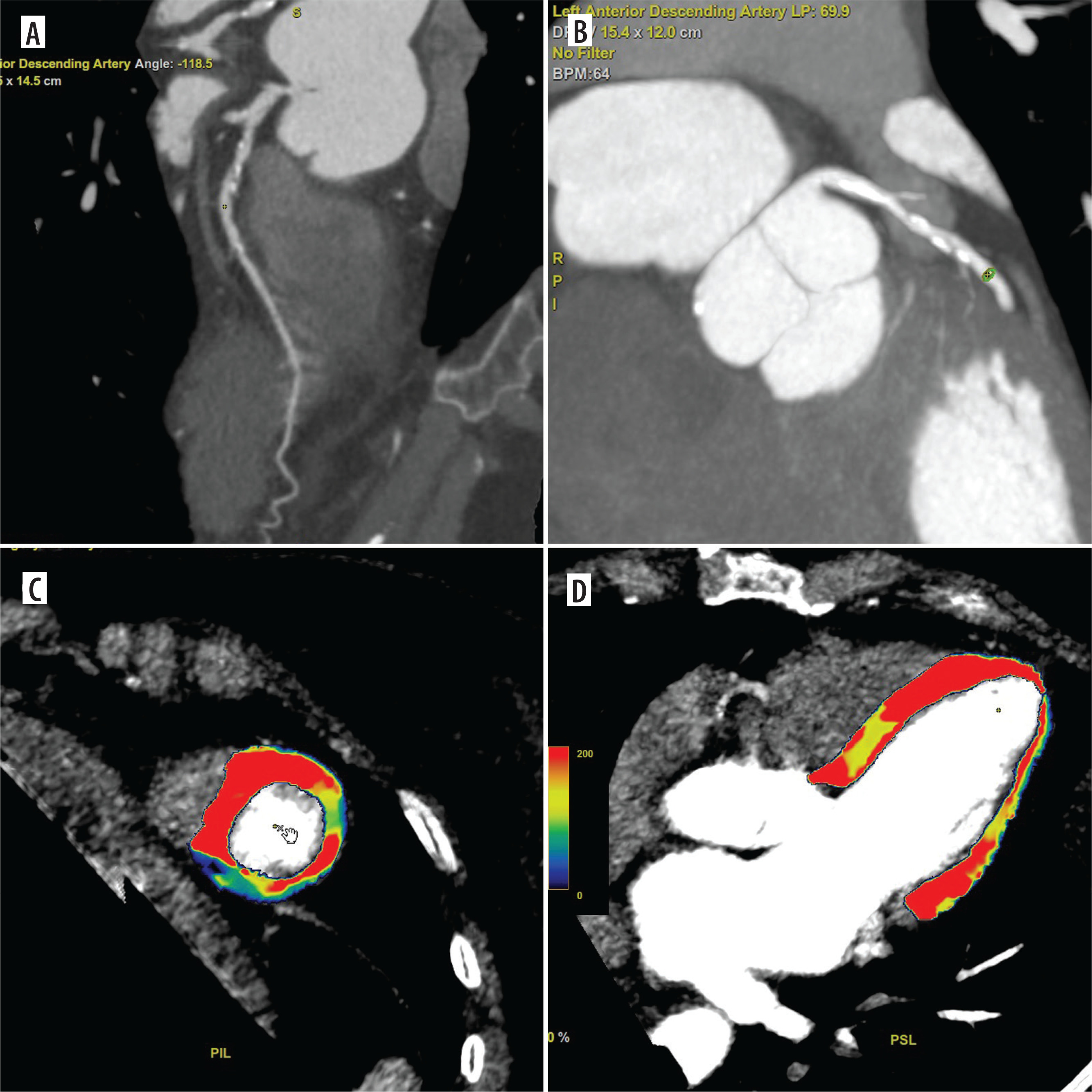 Coronary computed tomography angiography (CCTA) and dynamic computed tomography perfusion (CTP) scans from a 64-year-old female with non-specific chest discomfort and mild exercise intolerance. The patient underwent a comprehensive CT evaluation, including calcium scoring, CCTA, and dynamic stress CTP. CCTA revealed 30% stenosis in the left main (LM) and 50-60% stenosis in the left anterior descending artery (LAD) (A, B). Dynamic stress CTP with regadenoson showed reduced blood flow in the mid-anterior segment, apical anterior segment, and the border zone between the basal and mid-septal anterior segment (C, D). Based on the confirmed ischaemia, the patient was referred for invasive coronary angiography (ICA), which revealed 30% stenosis in the LM and a myocardial bridge in the LAD. The patient was deemed suitable for conservative management. Dynamic CTP Color-coding: Normal stress myocardial blood flow (MBF) is shown in red, and ischaemic regions (MBF < 100 ml/100 g/min) are depicted in blue
