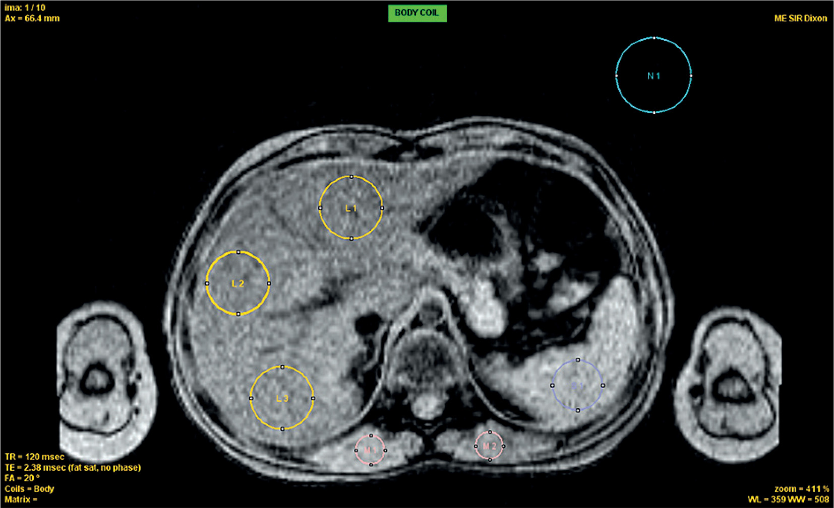 ROI placement for R2* analysis Axial ME-GRE image showing ROIs for liver (L1-L3, yellow), spleen (S1, blue), muscle (M1-M2, red), and background noise (N1, cyan). ROIs were selected to avoid vessels and organ boundaries. Acquisition: TR = 120 ms, TE = 2.38 ms, FA = 20°