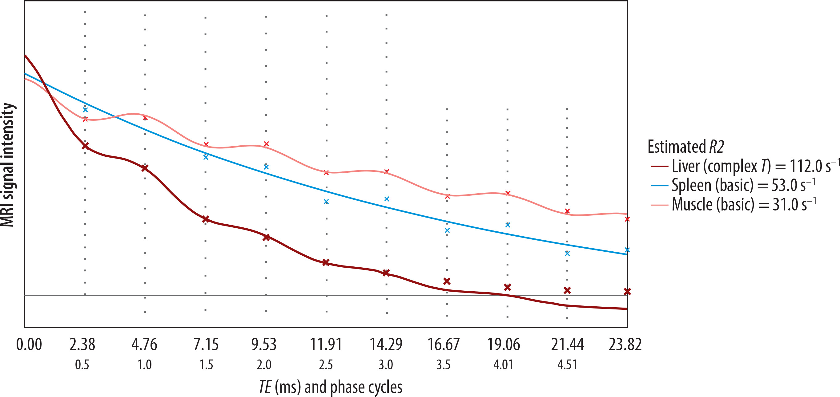 Signal decay curves and R2* fitting. Signal intensity decay as a function of echo time (TE) for liver (red), spleen (blue), and muscle (pink). Liver shows rapid signal loss, indicating elevated R2* (112 s–1). Spleen and muscle show slower decay (53 and 31 s–1, respectively). Noise level is indicated by the horizontal line (62.6). Curves are fitted using exponential models