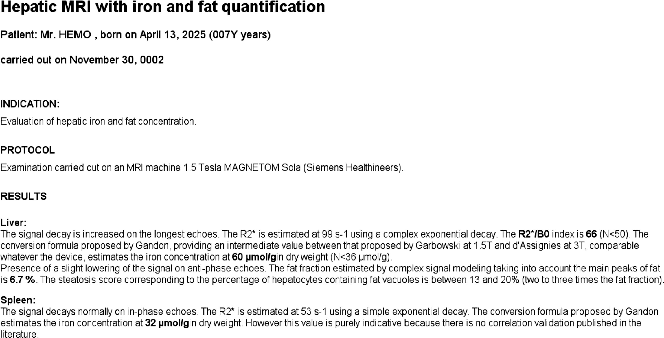 Automated liver iron and fat quantification report. R2* in the liver is 99 s–1, corresponding to an iron concentration of 60 μmol/g dry weight. Fat fraction is estimated at 6.7%, consistent with mild steatosis (13-20% of hepatocytes affected). Spleen R2* is 53 s–1 with an indicative iron level of 32 μmol/g