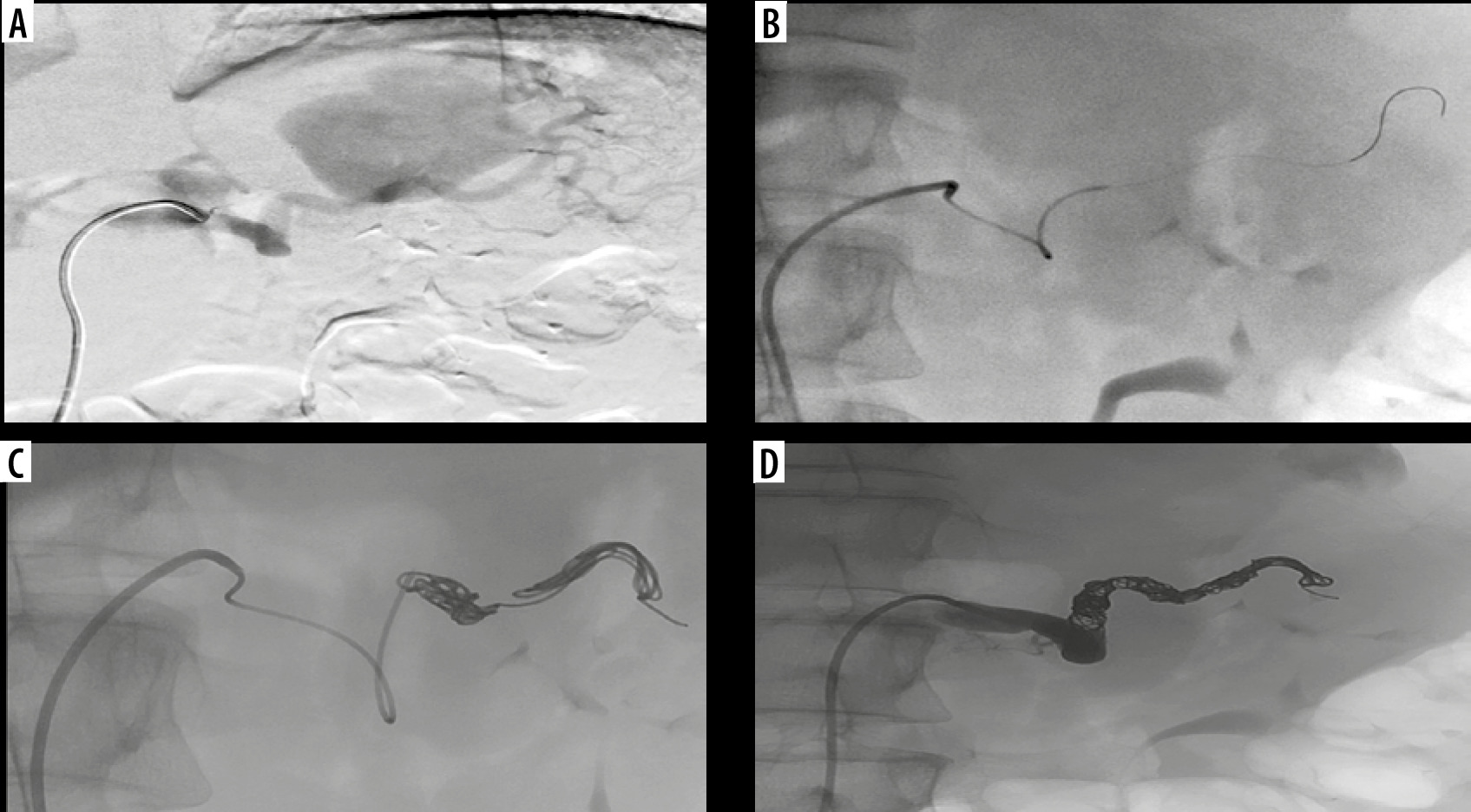 Digital angiography. Selective angiography of splenic artery confirming a giant pseudoaneurysm (A) and selective catheterization, employing a microcatheter, of distal portion of splenic artery (B). Endovascular embolization releasing multiple metallic microcoils into the in-flow and out-flow tracts of the giant pseudoaneurysm (C). Final angiographic control confirming successful endovascular exclusion of the pseudoaneurysm with opacification of the great pancreatic artery (D)