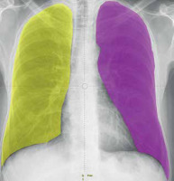 Radiographs were taken on a DR7500 unit (Care-stream Health, Inc., Rochester, NY, USA). Image texture parameters were analysed with LIFEx software using DICOM files [20,21]. The following initial assumptions were made: 128 shades of grey tested, and the region of interest (ROI) separate for each lung (Figure 1). All the available texture parameters were analysed. A result was a positive diagnosis of COVID-19 pneumonia in the test group vs. control group. Results included only significant parameters.