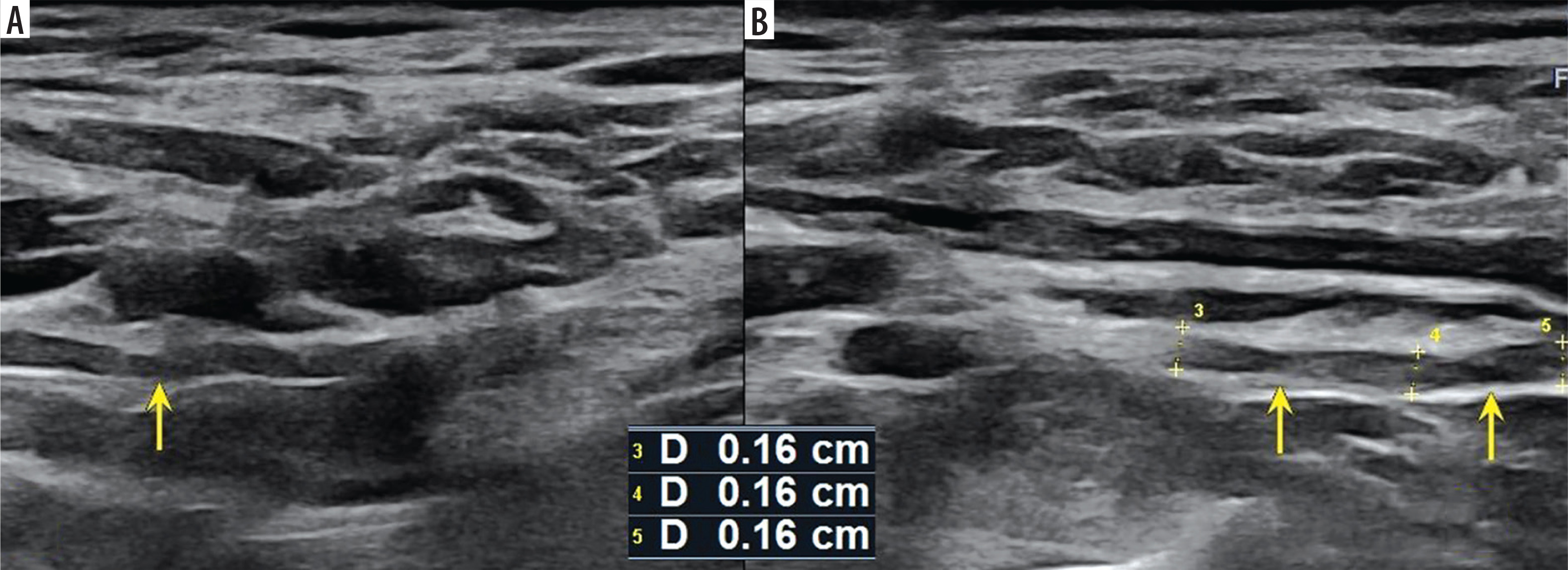 High-resolution ultrasound image of the suprascapular nerve torsion with a double “hourglass-like” constriction sign – marked with arrows (B) in 57-year-old patient with Parsonage-Turner syndrome in comparison with asymptomatic side (A). Images obtained by author with a 3-19 H linear probe of the Alpinion XCube90