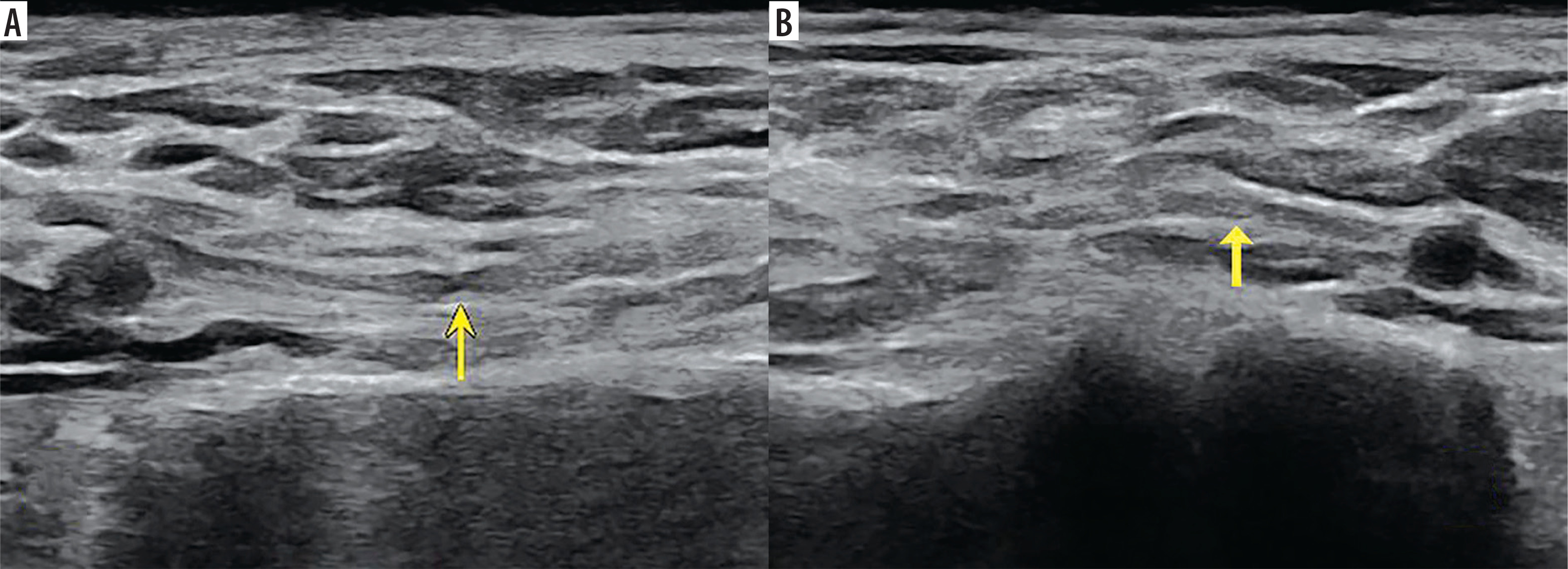 High-resolution ultrasound image of LTN torsion with an ”hourglass-like” constriction sign – marked with arrow (A) with comparison to the asymptomatic side (B) in 50-year-old patient with Parsonage-Turner syndrome. Images obtained by author with a 3-19 H linear probe of the Alpinion XCube90