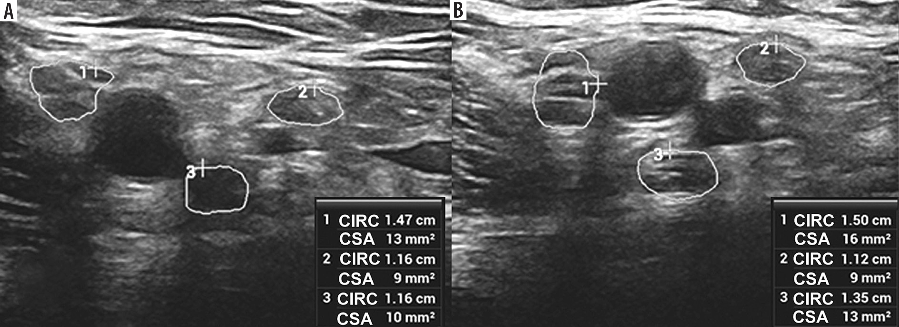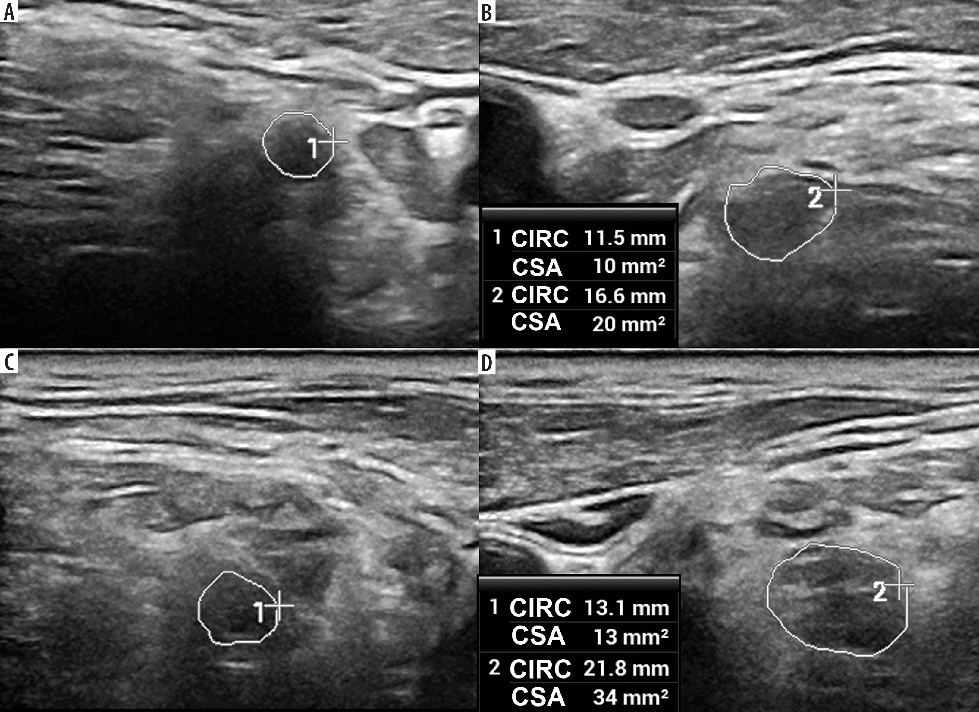 High-resolution ultrasound image of the C5 (A, B) and C6 (C, D) roots with cross sectional area (CSA) measurements in 57-year-old patient with Parsonage-Turner syndrome. Root swelling, reflected by increased CSA and circumference (CIRC) detected on the symptomatic side. Images obtained by author with a 5-20 MHz linear probe of the Mindray Resona I9