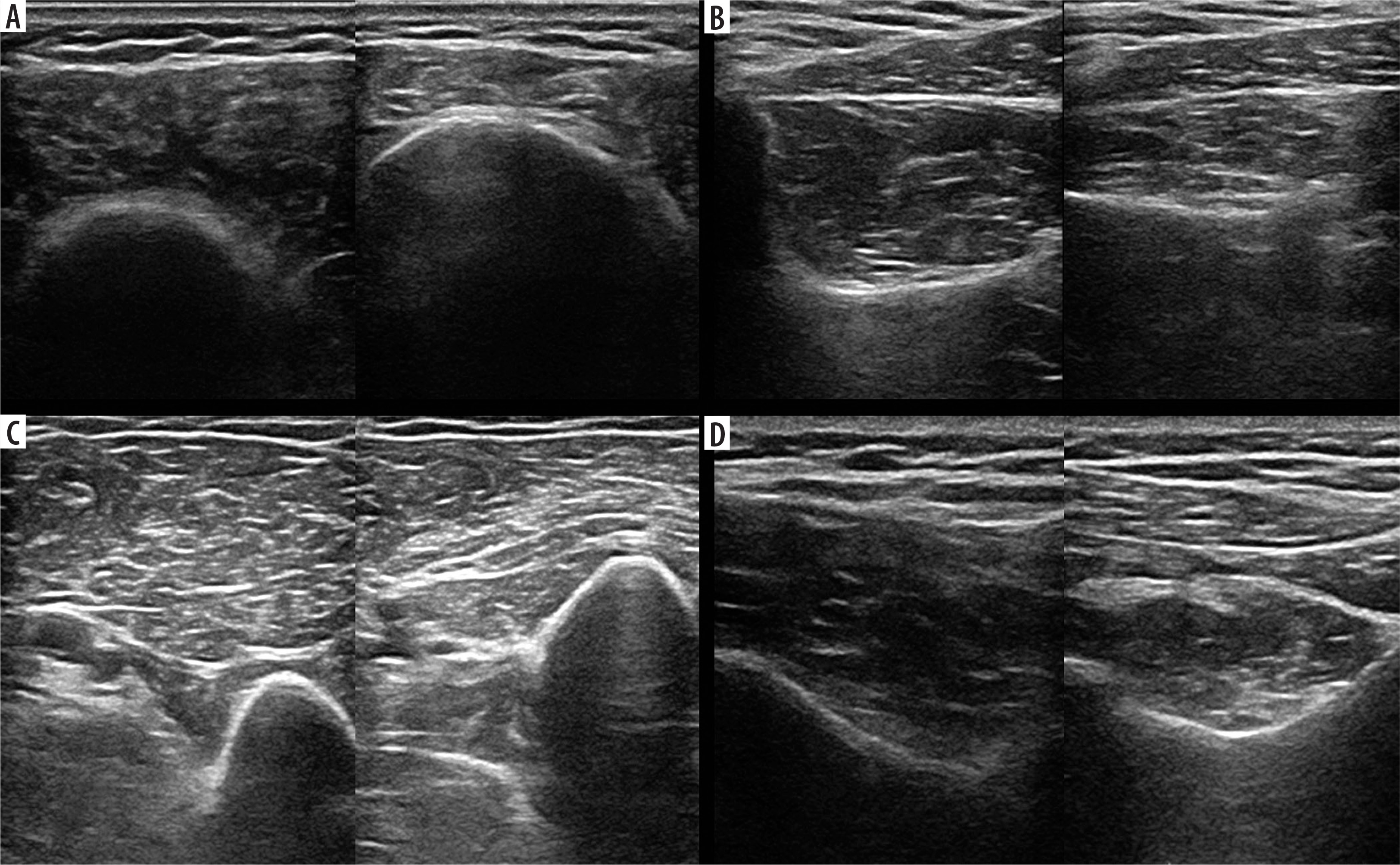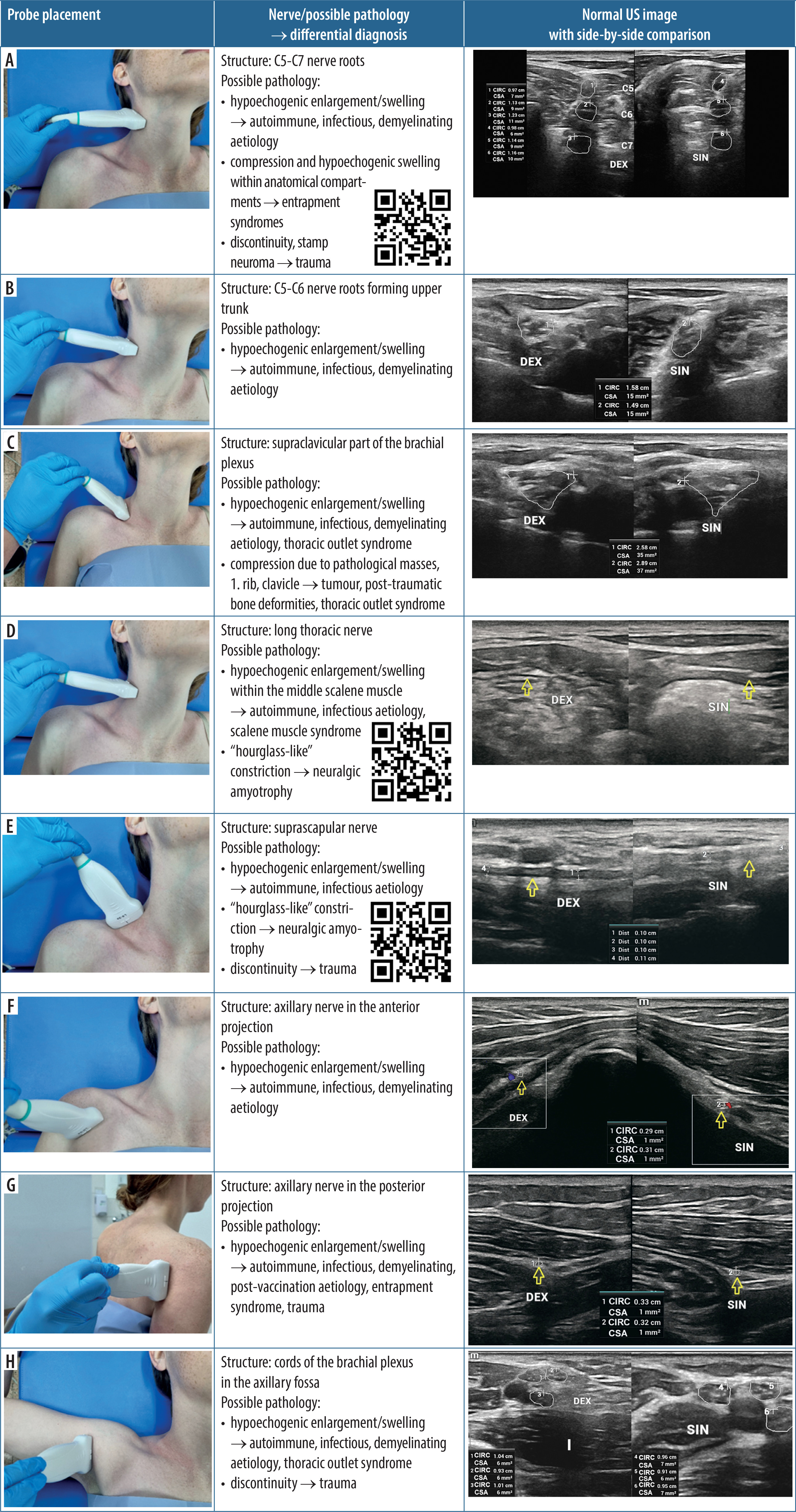 Major clinical pathologies of the brachial plexus may manifest as a similar neurological syndrome. Therefore, a reproducible examination scheme is required for accurate evaluation of the brachial plexus. The proposed HRUS protocol for brachial plexus evaluation is shown schematically in Table 1. It focuses on the rapid detection of key pathologies that may be the underlying cause of upper extremity paresis and pain. It includes evaluation of the C5-C7 roots at the point of exit between the transverse processes of the cervical spine and between the scalene muscles with measurement of the cross-sectional area (CSA) (Table 1A). Once the roots have been assessed, the upper trunk formed by the C5 and C6 roots (Table 1B) is a good landmark to examine in case of structural changes of the scalene triangle, e.g. post-traumatic. This is the point of examination when the C7 root also enters the middle trunk and the C8 and Th1 roots form the lower trunk. In the supraclavicular fossa, the entire area is evaluated with HRUS (Table 1C). Assessment of the major components of the brachial plexus is followed by identification and examination of the short branches. The long thoracic nerve is assessed within the middle scalene muscle and is best seen at the level of the C6 nerve root (Table 1D). The suprascapular nerve is then assessed along its course from the upper trunk (UT) to the scapular notch (Table 1E). Evaluation of the axillary nerve in this protocol includes visualisation of its anterior and posterior projections. The probe should be placed under the coracoid process and then rotated obliquely to locate the coracobrachialis muscle. The circumflex humeral artery and associated axillary nerve are visible at its edge (Table 1F). This projection provides the opportunity to visualise a CSA of the axillary nerve behind its bifurcation from the posterior bundle. A posterior projection can be obtained by positioning the transducer vertically within the posterior surface of the shoulder muscle to visualise the quadrangular space along with the axillary nerve and the posterior circumflex humeral artery that emerge from it, which, as with the anterior projection, provides a good reference point for determining the anatomical relationships between the structures being examined (Table 1G). The axillary fossa with evaluation of the medial, lateral, and posterior cords is the final stage of the brachial plexus HRUS protocol (Table 1H). The table lists examples of pathologies observed at appropriate levels of ultrasound examination of the plexus. It is important to identify not only individual lesions, but also their distribution and mutual coexistence within the brachial plexus, which determines the different clinical approach to numerous neurological disorders, including: typical and focal forms of CIDP (chronic inflammatory demyelinating polyradiculoneuropathy), conduction block at the level of the plexus in MMN (multifocal motor neuropathy), PTS, infectious brachial neuritis, and TOS (Table 2) [9].