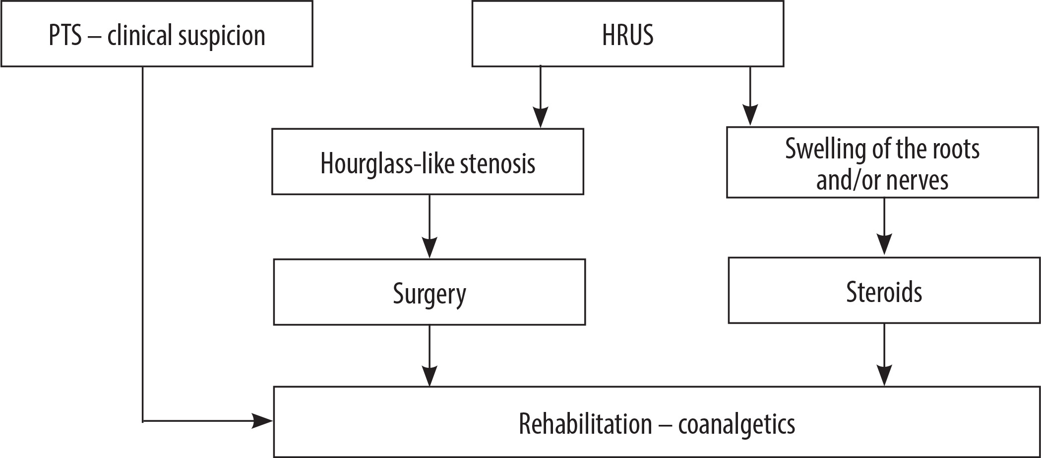 The use of HRUS can significantly assist in the identification of the problematic nature of neuropathic pain and paresis in the upper extremities. Complex HRUS examination of the interscalene triangle area in differential diagnosis allows precise determination of the type and extent of damage to neural structures in each of the above syndromes. As a result, an ultrasound examination can facilitate the precise management of PTS and neuroborreliosis according to their characteristic radiologic features.