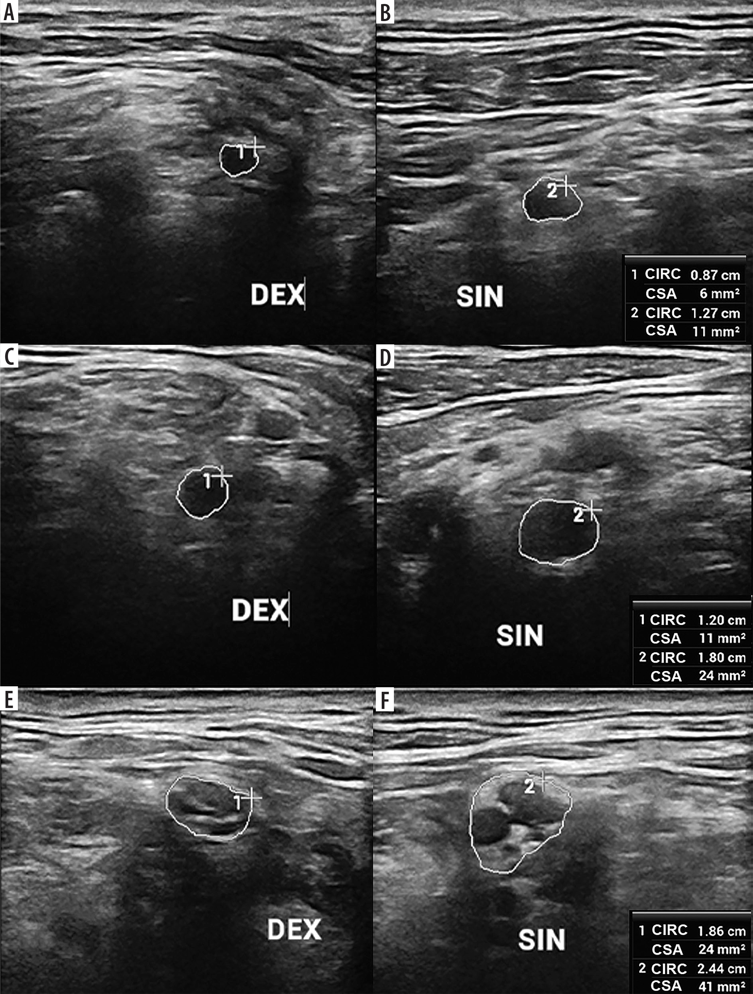 High-resolution ultrasound (HRUS) image of the C5 (A, B) and C6 (C, D) roots and upper trunk (UT) (E, F) in 66-year-old patient with the left upper limb paresis due to neuroborreliosis with Banwarth syndrome. Side-by-side comparison with increased measurements on the symptomatic side. Images obtained by author with a 5-20 MHz linear probe of the Mindray Resona I9