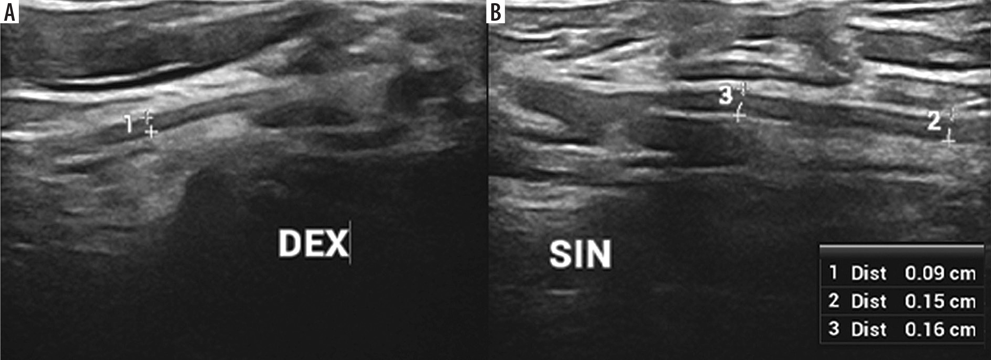 High-resolution ultrasound (HRUS) image of the suprascapular nerve (DEX – asymptomatic side, SIN – symptomatic side) with measurements in brachial neuritis due to neuroborreliosis. Side-by-side comparison. Images obtained by author with a 5-20 MHz linear probe of the Mindray Resona I9